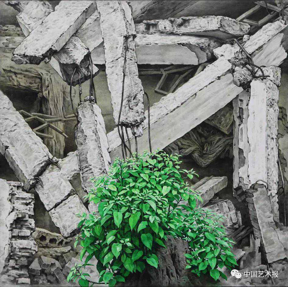 傅森年《五月·重生》布面油彩150cm×150cm2009年(此作品曾参加“纪念5.12汶川大地震一周年全国美展”与“第四届北京国际美术双年展”)