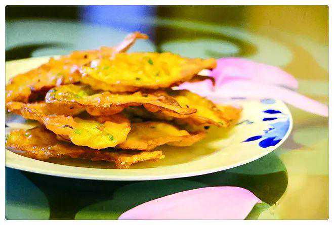 3.将沾上面糊的花瓣放入油温适宜的锅内炸至两面金黄。