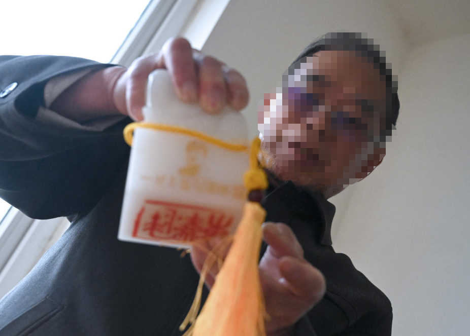 介绍完了桌子上的“藏品”,老彭领着记者到他的卧室,那里面还有他的“玉石”收藏。从一个盒子里翻出一个小布口袋,从布口袋里又摸出一个保鲜膜裹住的玺一样的印章。再从另一个小方盒里,老彭小心拿出一个保鲜膜包裹的玺状的印章,比前一个更大更沉。“这两个据说价值不菲”,老彭说陌生电话来推销时,他花了万元左右买到的。