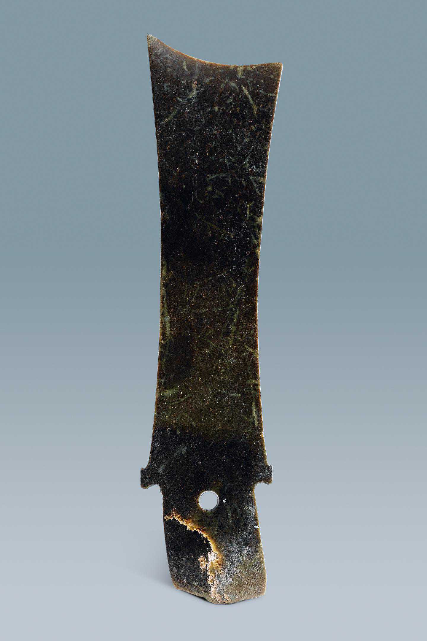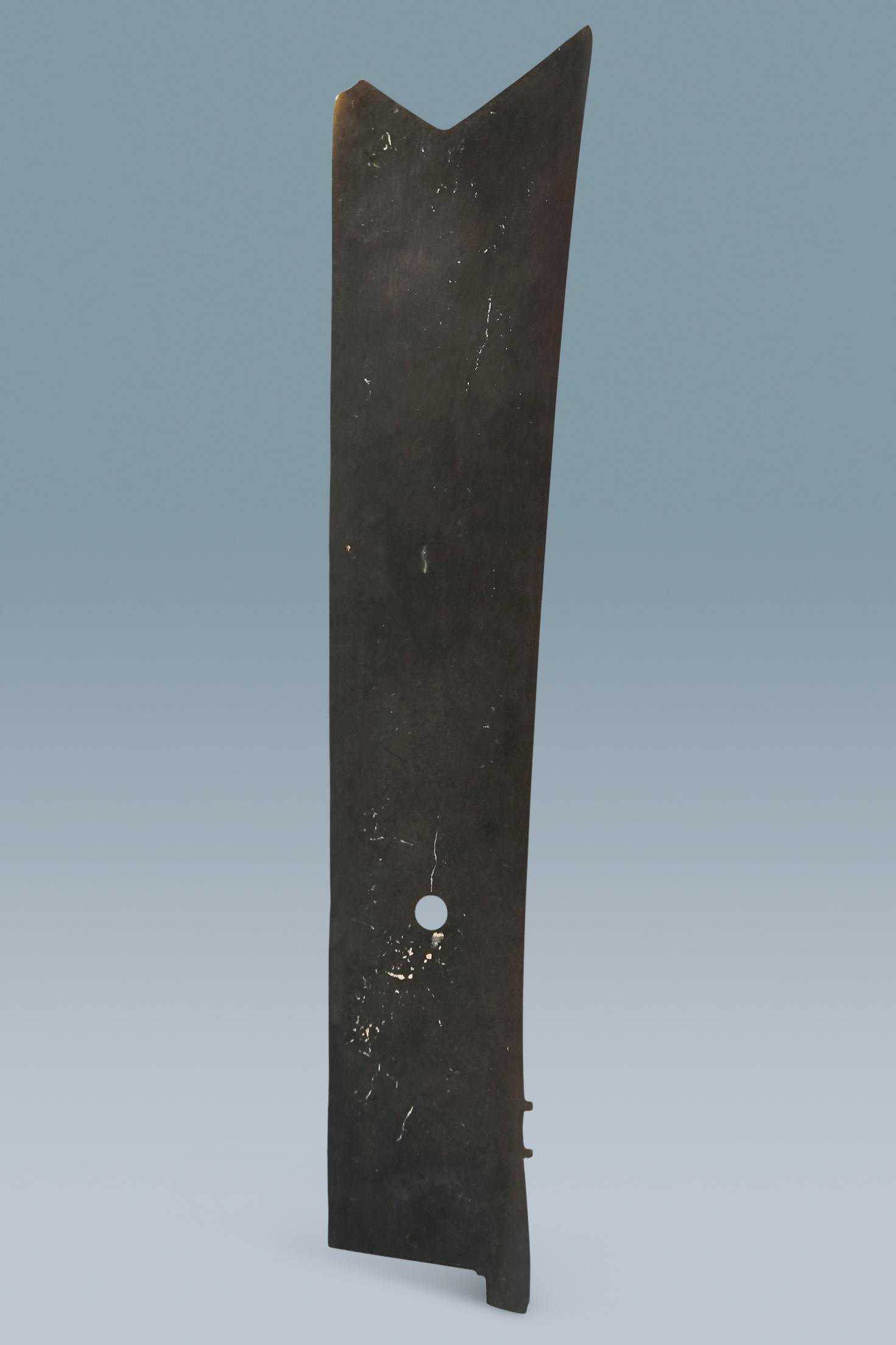 8.牙璋(馆藏号:27859),长29.7、宽6、厚0.7、孔径1厘米。玉呈黑色,内含灰绿、灰黄色枝条状纹。身窄长,两侧略凹弧,内弧刃,长方形柄,身、柄之间阑部两侧各出一宽牙,牙前又各出一组双齿的小扉牙,柄近阑处单面钻一孔(图8)。