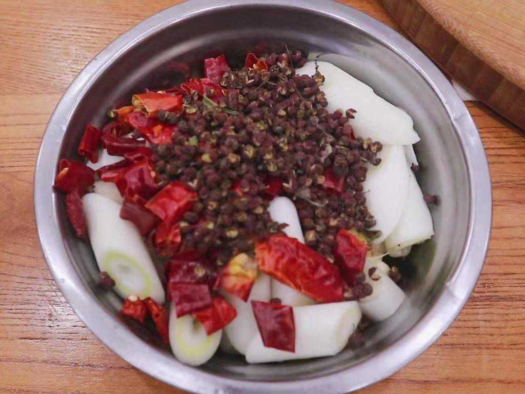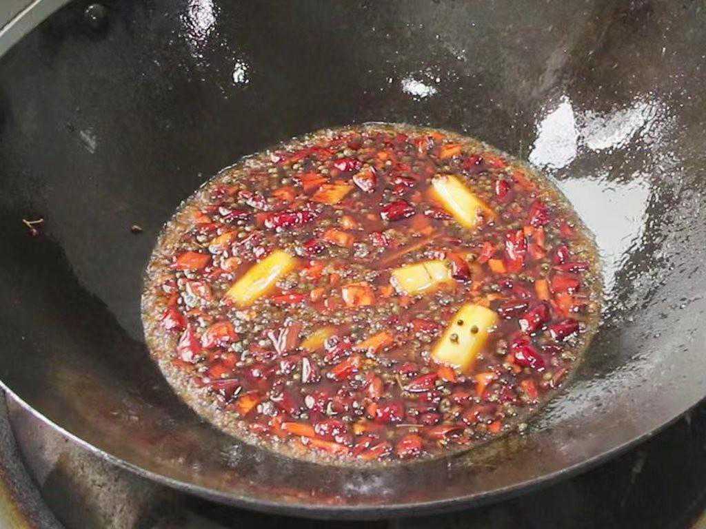 3、锅内留底油把底料炒一下,油烧热以后放入葱姜和泡椒,翻炒出香味。倒入花椒、麻椒等料,翻炒出香辣味。随时观察干辣椒的颜色,免得炒糊。再把酱料倒入锅中,快速搅拌化开酱料。炒出豆瓣酱的红油和香味时,就沿锅边淋入适量清水,加入料酒5克去腥、生抽5克、白醋5克搅拌均匀。