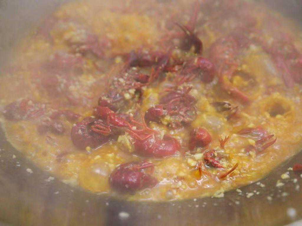 5、锅底留油,将咸蛋黄用小火不停地翻炒。炒到咸蛋黄起泡,下入炸好的小龙虾、葱花、白芝麻翻炒均匀即可出锅。