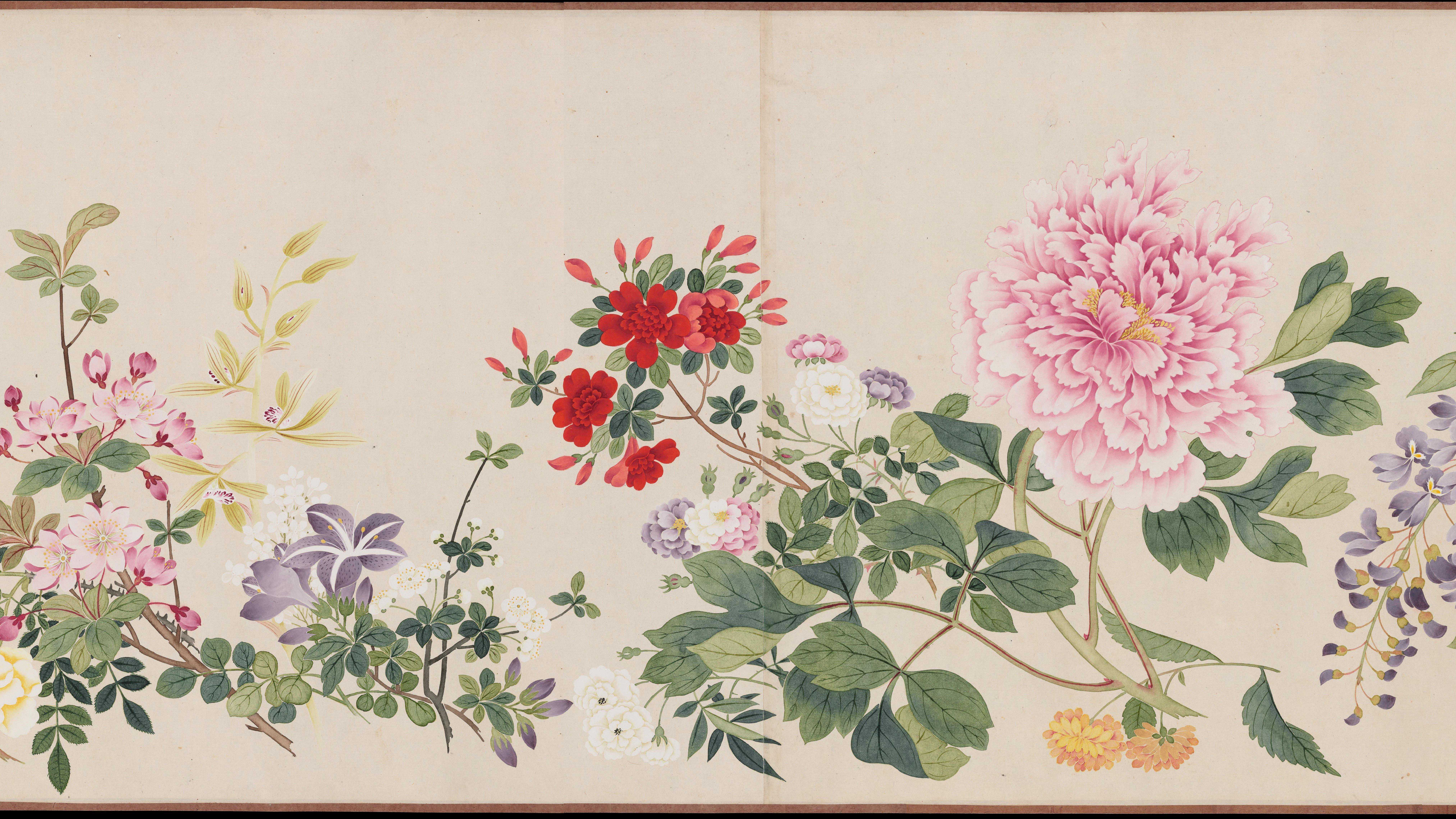 此图卷由清代画家钱维城绘制。画卷以折枝的方法将生长于不同时节的几十种花卉,密密匝匝地按大小依次穿插,整齐地排列在画面中。以没骨法绘写花叶、花瓣,形态逼真。钱氏画风以干笔勾勒,重视烘染,笔墨浑然,用笔缜密,以青绿、赭石相间设色,极富宫廷富贵气息。此卷现藏于美国波士顿美术馆。