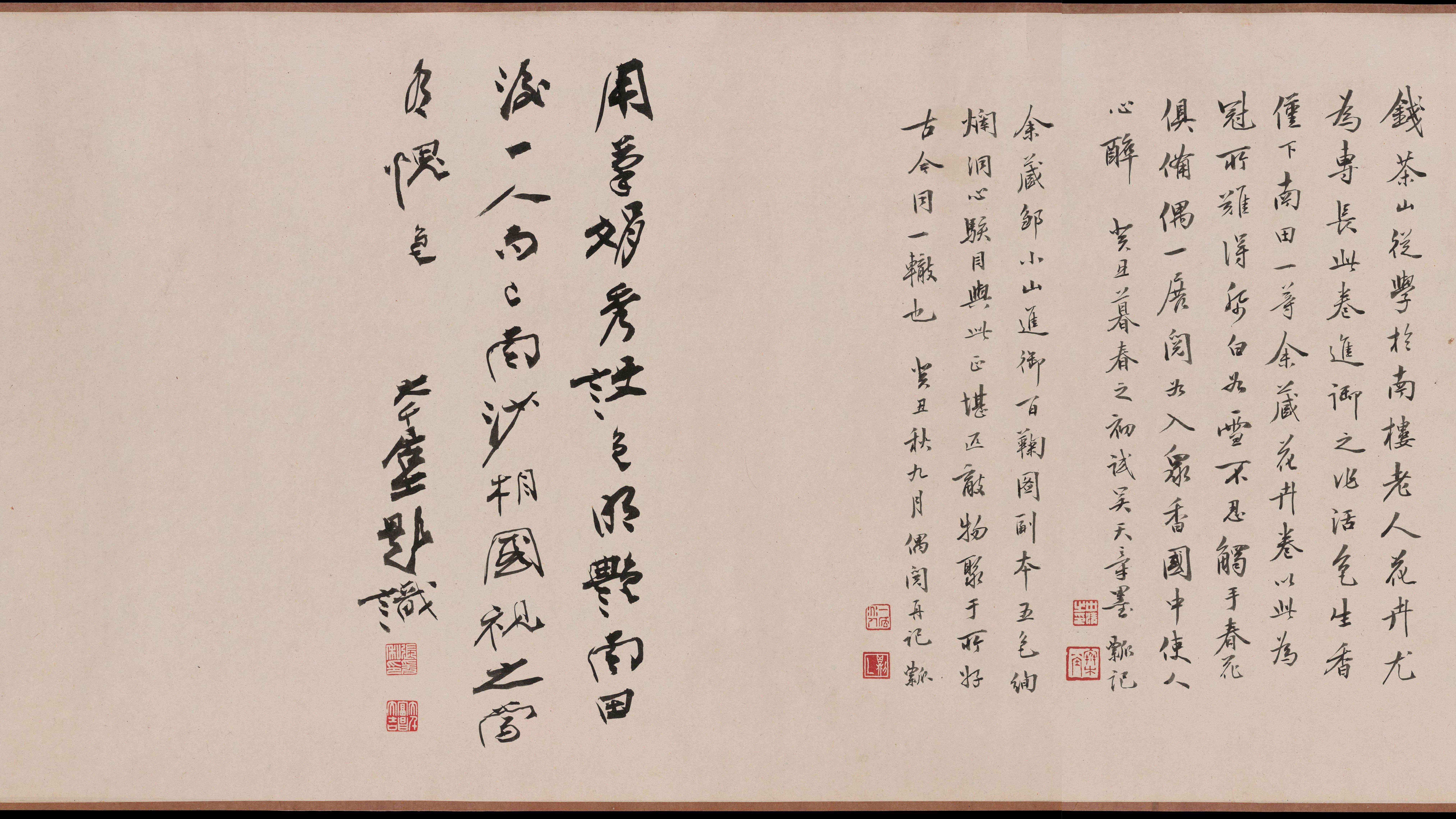 跋一:钱茶山从学于南楼老人,花卉尤为专长。此卷进御之作,活色生香,仅下南田一等。余藏花卉卷,以此为冠。所难得纸白如雪,不忍触手,春花俱备,偶一展阅如入众香国中,使人心醉。癸丑暮春之初试吴天章墨。瓢记。