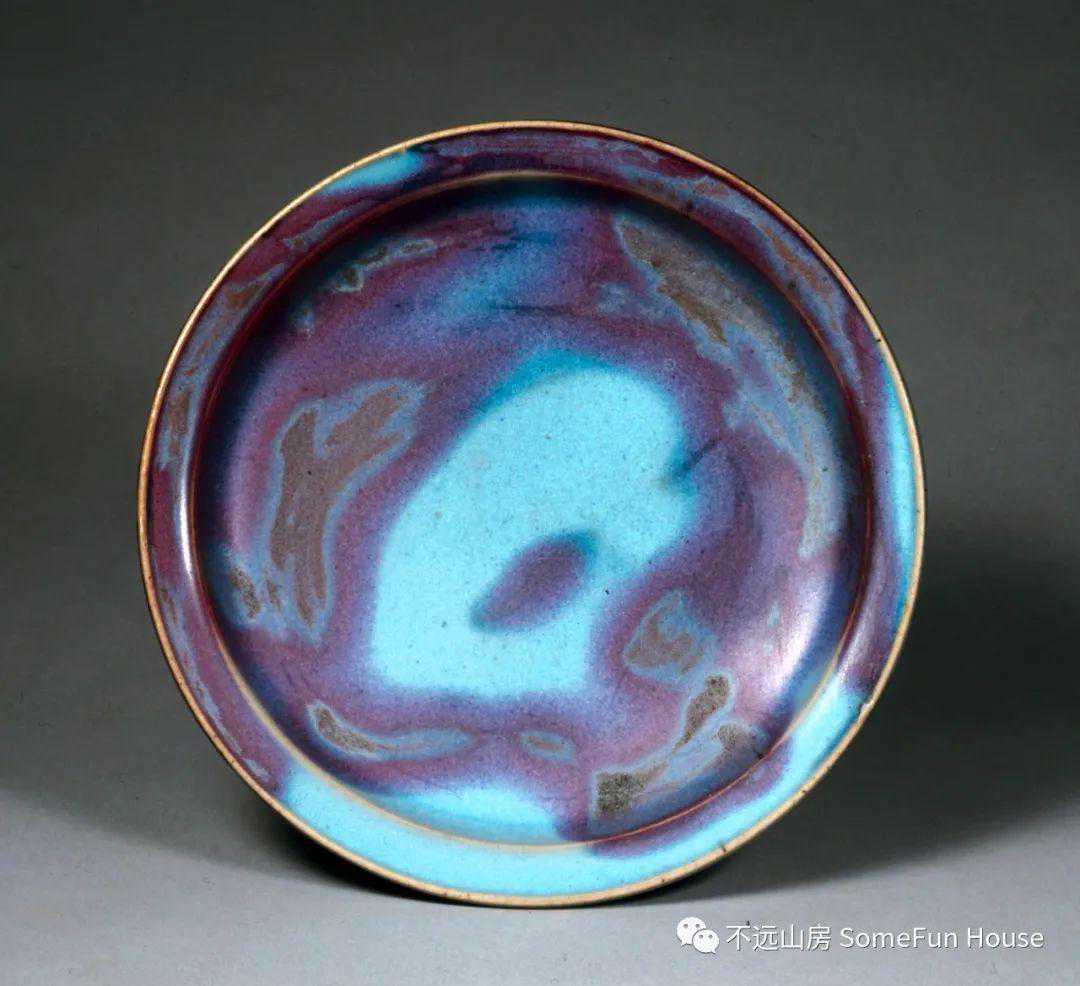 美国克利夫兰艺术博物馆藏宋-金钧窑天蓝釉紫斑折沿盘。口径:18.1厘米。