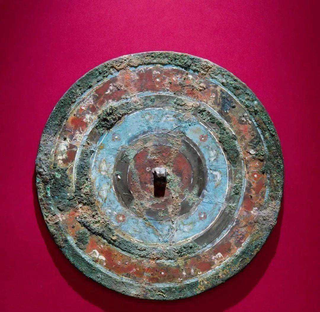 战国彩绘铜镜的彩绘图案主要有红、蓝、白、绿等颜色构成,彩绘颜料为矿物质成分,红色主要为朱砂,蓝色主要为蓝铜矿石,白色主要为羟磷灰石。主要工艺是直接在铜镜表面进行平涂施彩。战国时期,虽然铜镜已成为日常生活用品,但彩绘铜镜属于比较少见的镜类