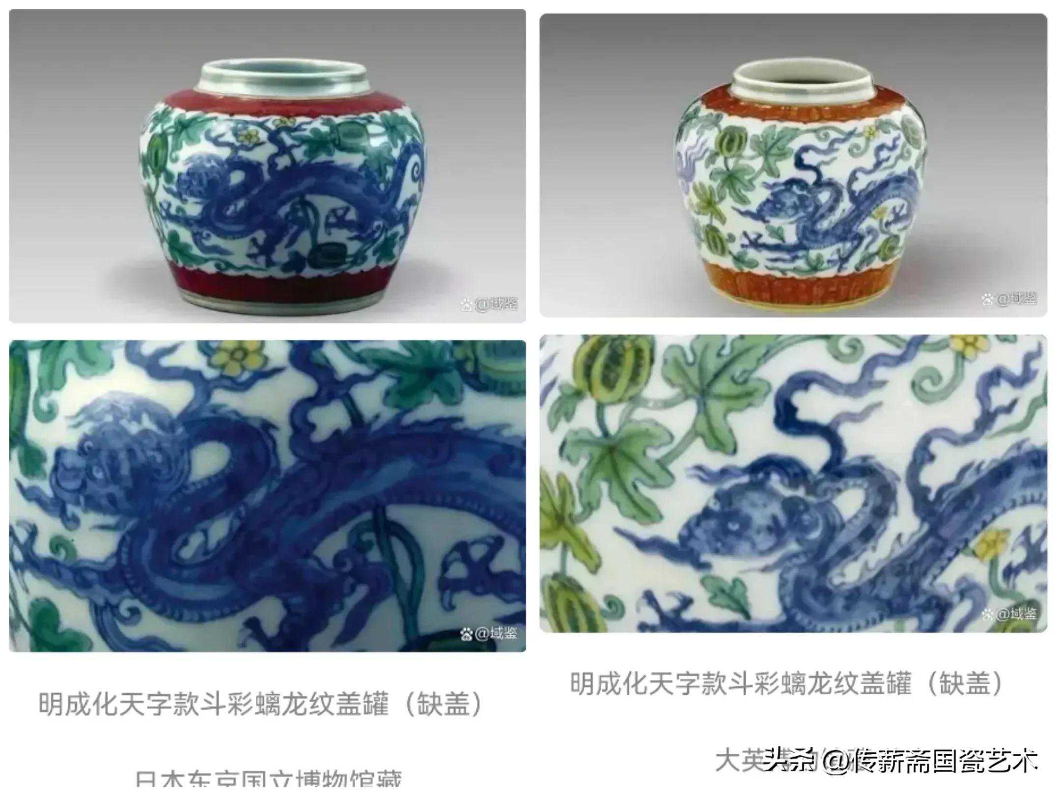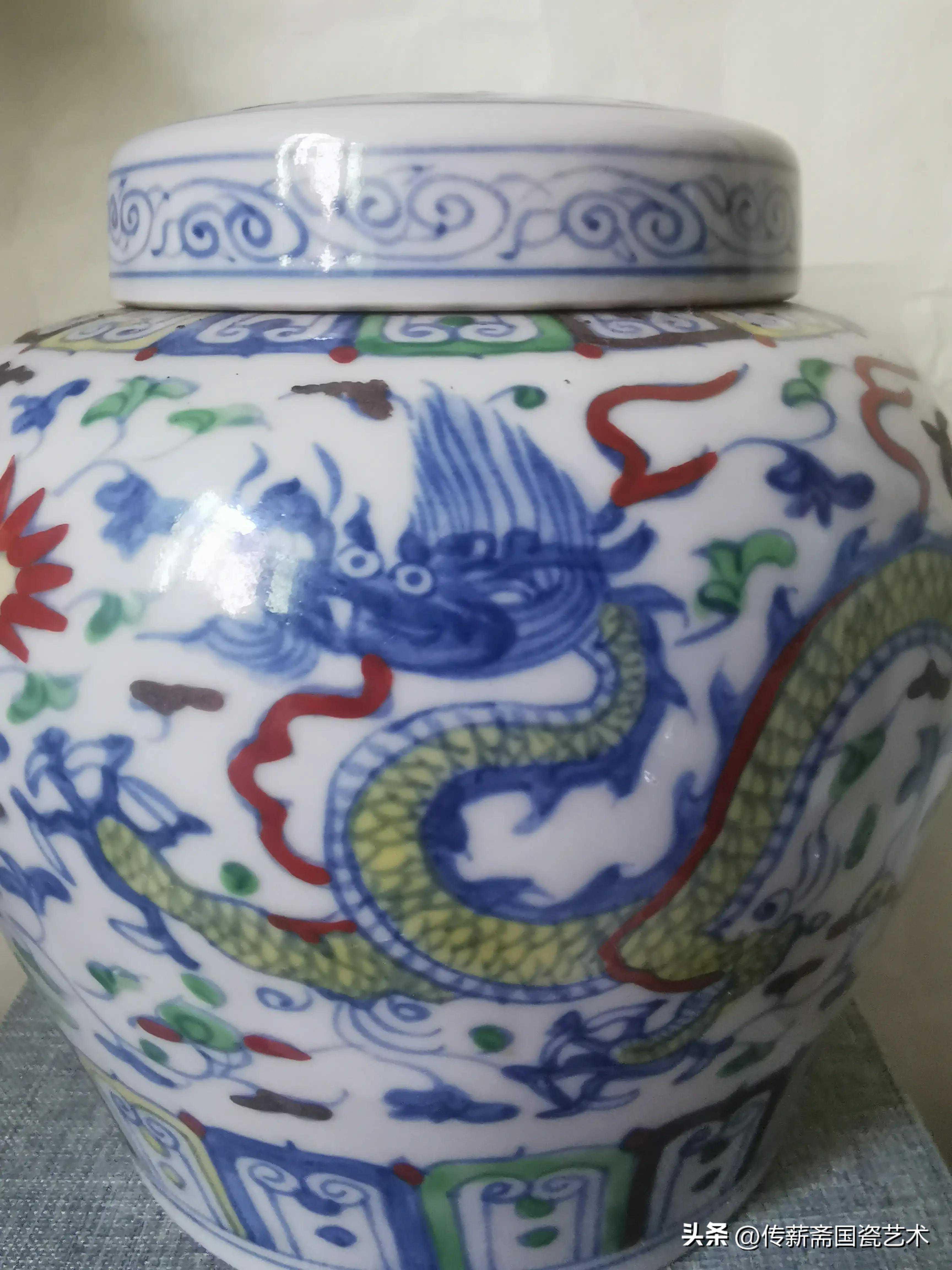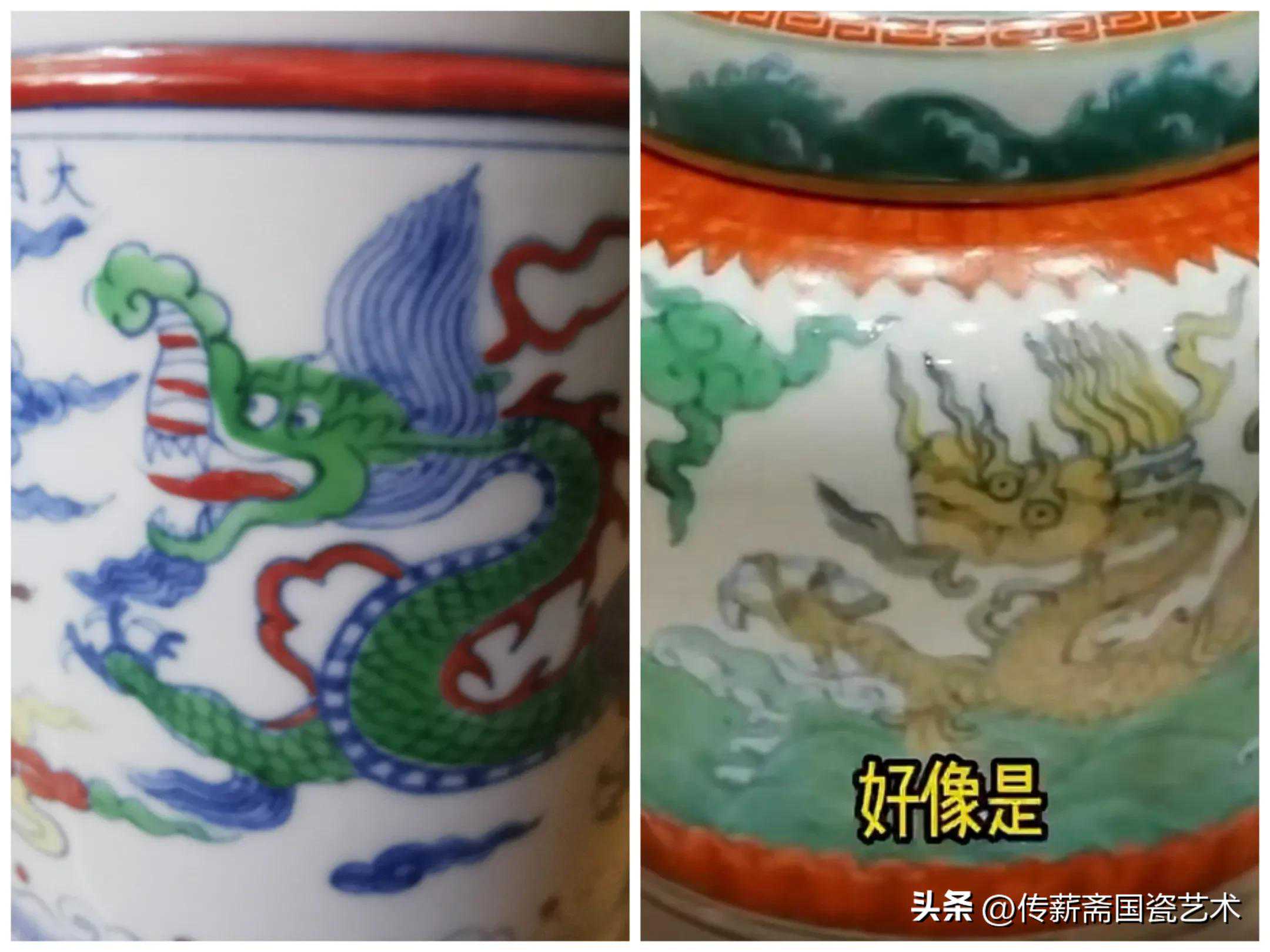 其实成化之龙纹翟健民并不熟识,成化龙纹有几个特点,一是眼睛像戴着眼镜,也叫“眼镜龙”,眼睛它是横向排列的。二是嘴巴闭合,龙爪特别像风车。看上去非常温顺,只有头发竖起,却没有一点龙的威武霸气像卡通图片。特别此天字罐也是红彩露出破绽,成化斗彩红彩有二种,一是油红,色浓艳深沉而有光;二是鲜红,艳如血涂抹不匀而无光。此罐红彩过艳不深沉不类成化之油红。