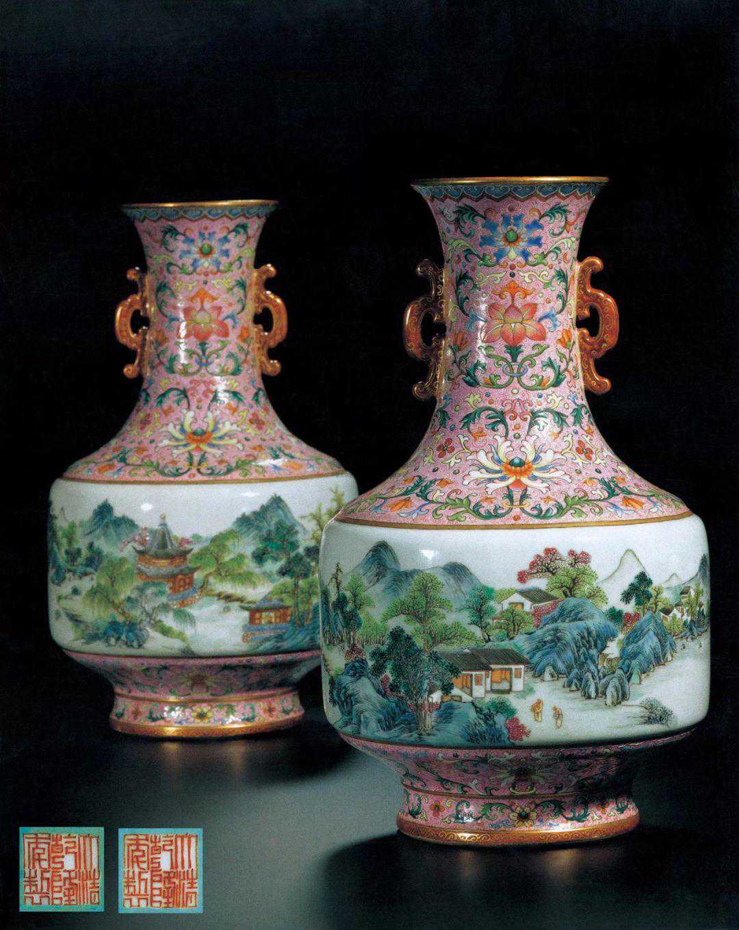 第18名清乾隆粉红地「锦上添花」粉彩通景「山水庭廓」图双耳撇口瓶(一对)
