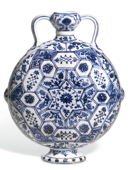 永乐年间(1403-24年),御窑作坊出品各式瓷器,新颖独特,永乐帝对此应甚为熟悉。然而本壶器形纹饰,实属其中最为巧妙之作。该时期之瓷作,器形多以中东雏本为模,唯本品器形纹饰出类拔萃,更胜同侪。如此几何纹饰,明显取自中东样式,繁复华丽,罕见于中国御瓷,即使元代(1279-1369年)与中东交流密切,几何构图流行于青花盘,亦仅取中东器之构图,纹饰仍然纯属中式,不如本品伊斯兰风格浓厚。
