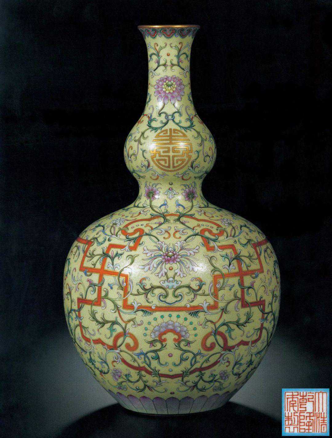 此件浅黄地长颈葫芦瓶之形制与纹饰皆为乾隆时期景德镇御作经典样式,图案设计雅致尊贵,装饰极富奢华品味,为此类工艺品中最具格调之御瓷佳作。
