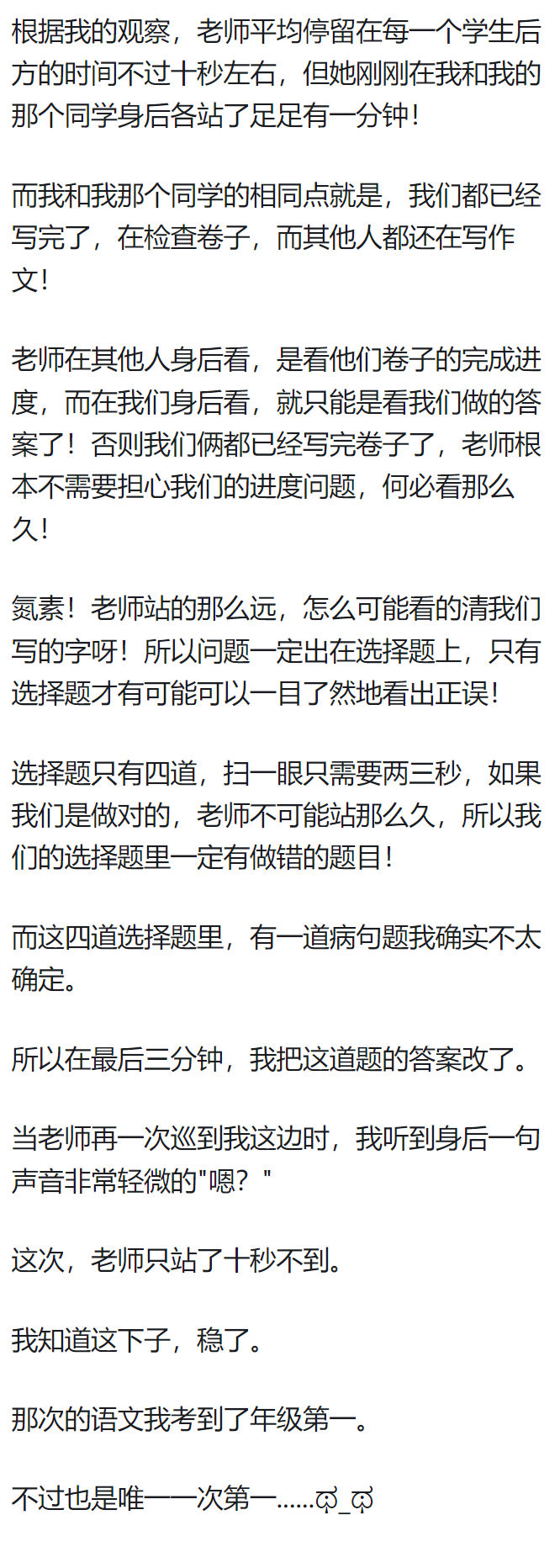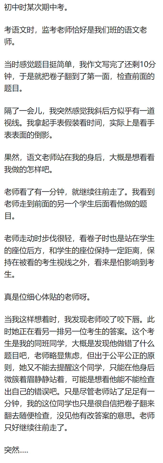 我初中数学考试也有一次,期末考试,监考的是我们班主任。我有道几何大题一直做不出来,我老班遛到我这里,用指甲(女)给我画了条辅助线。