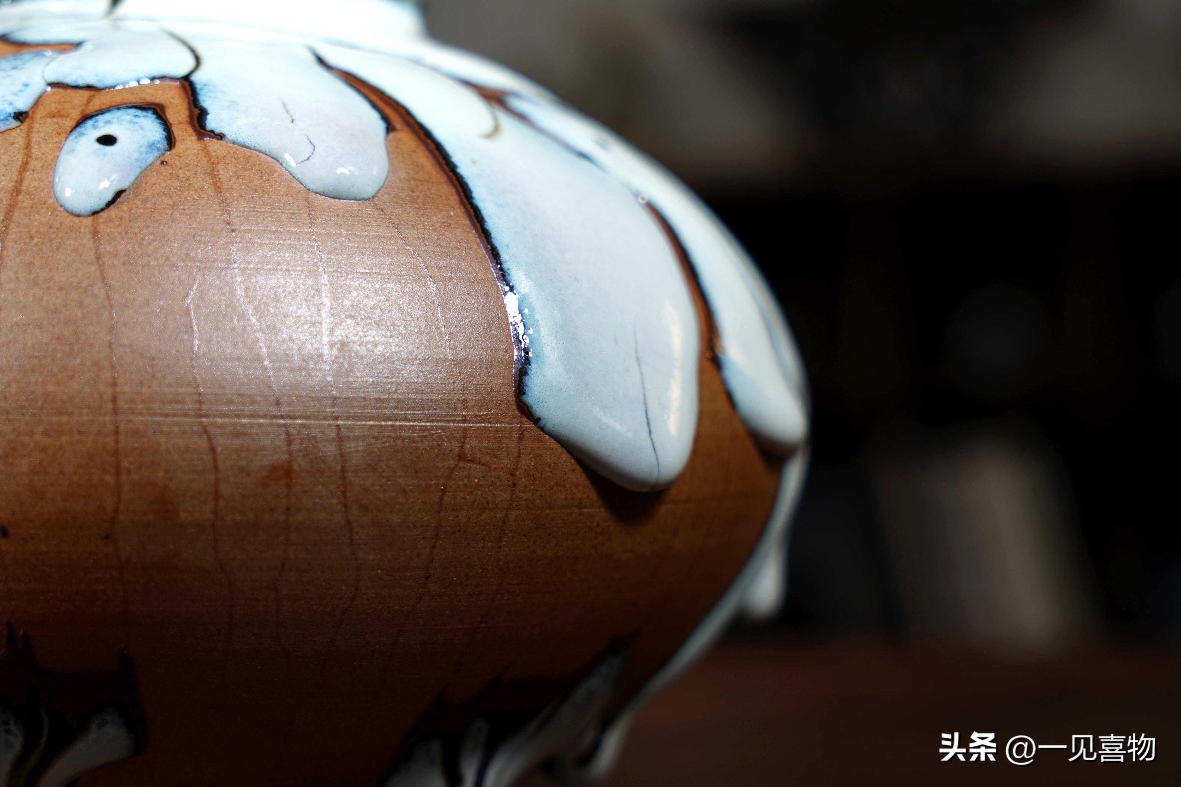 《迹》的呈现是洒脱之感。釉水之间的贯穿给观者带来非凡气象,它的流动丰富,在厚重的地方彰显厚重之姿,细腻的地方呈现婉转之美。在蓝之上,更有白色呼应,釉之上,有飞雪翩翩起舞的冬日,也有夏日炎炎的沟沟壑壑。它的呈现是季节的更替,只不过,《迹》更加表现出冬夏,这两季更具变化,给人一种反差感。