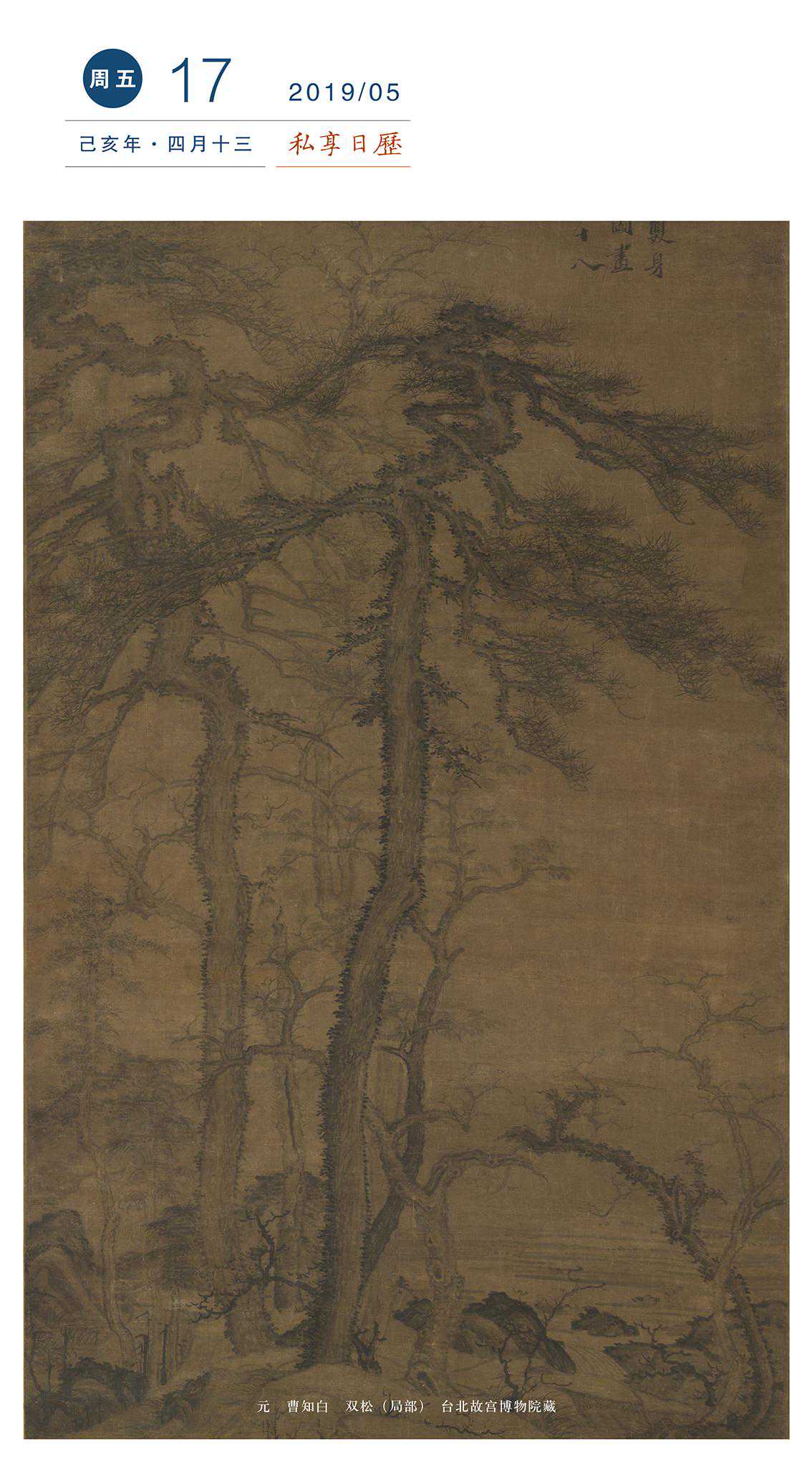 滨水石坡上两棵虬松,拔地而起,势如参天,背衬以杂树,掩映在烟霭中,渐远渐晦。并立双松,干顶枝条向周围虬蟠伸长,旁配以远水,成无尽景,画成于1329(天历二年),时年曹知白五十八。以松树成为山水画中描摹的一重点,概与元朝整个大环境有关,画家藉事物明志,而松之坚拔,使双松正可作为友情坚贞之象徵。