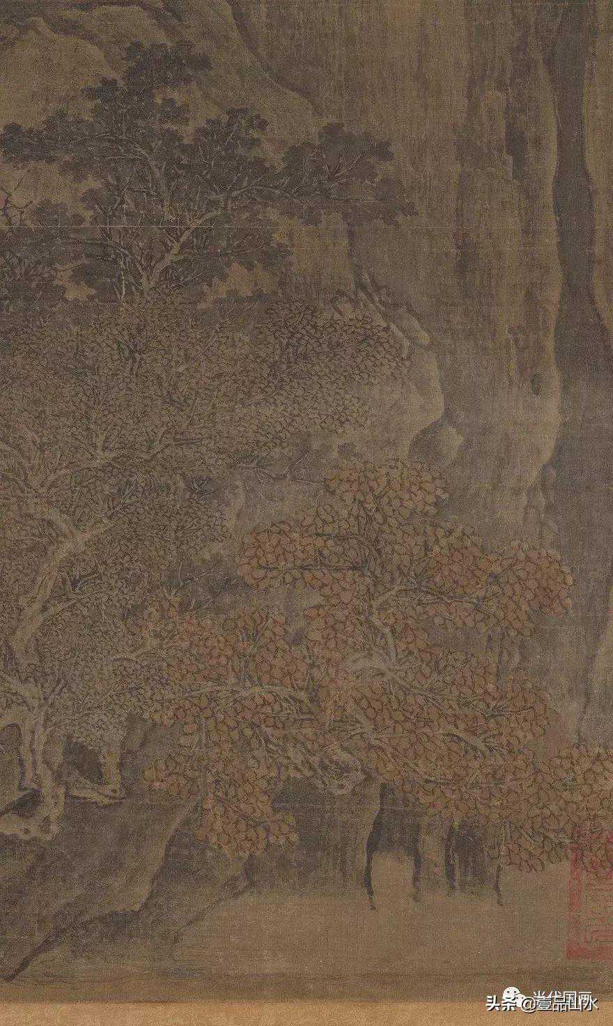 画面正中画峭拔的主峰,山涧丛生寒林秋树,涧水悬瀑曲折而下,气势壮伟。画上无款,仅边幅上有明代王铎题语,指明为“关仝真笔”,并誉为“结撰深峭,骨苍力垕,”“磅礴之气,行于笔墨外”。画上钤有明纪察司半印及“秘园”、“乾隆御览之宝”等收藏印章,《石渠宝芨初编》著录