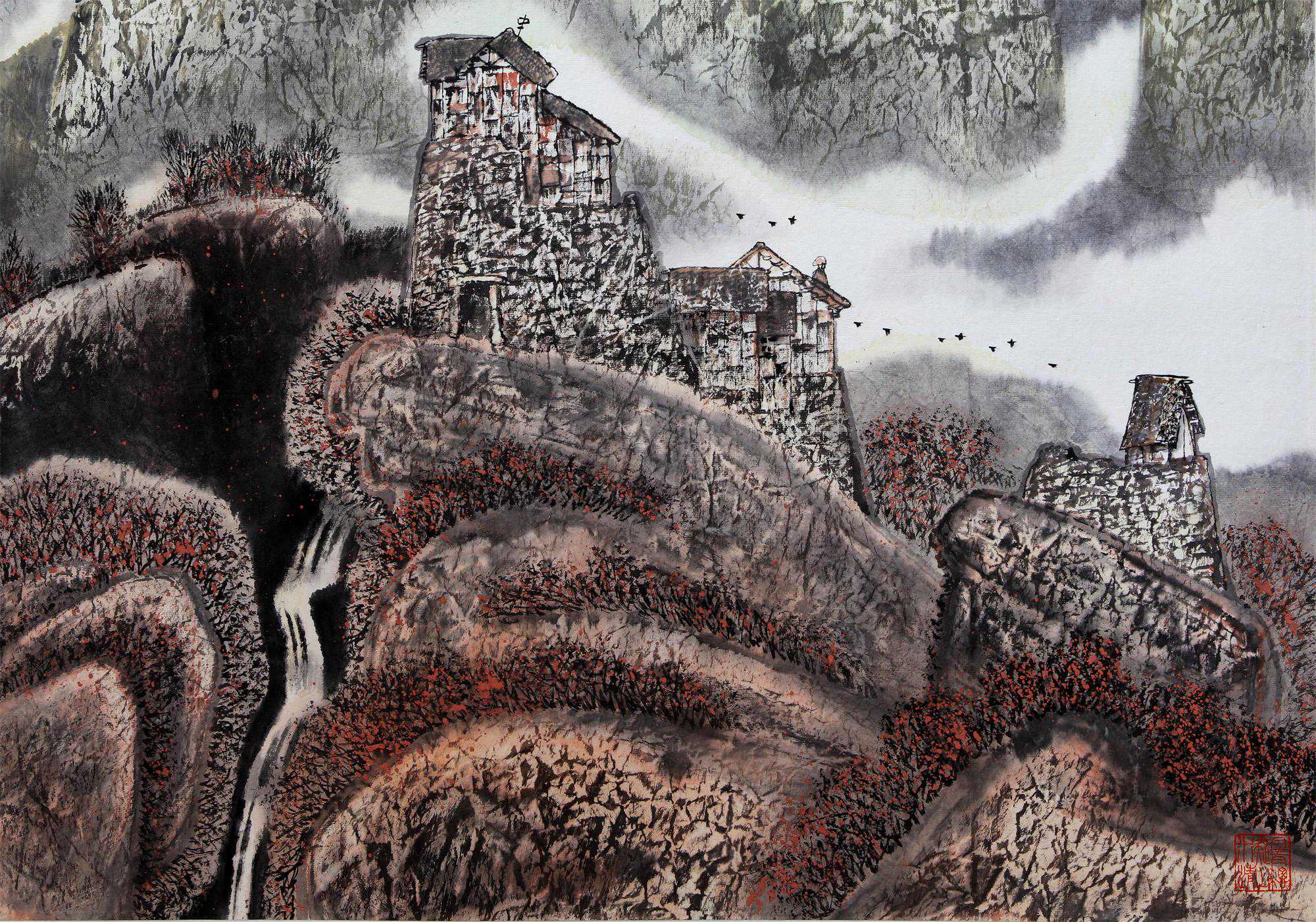 青山红叶、白云飞瀑、山居屹立、飞鸟遨游。空灵处竟有人烟、厚重处孕育山泉。此情此景,美不胜收。。。。。。