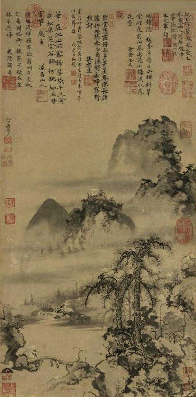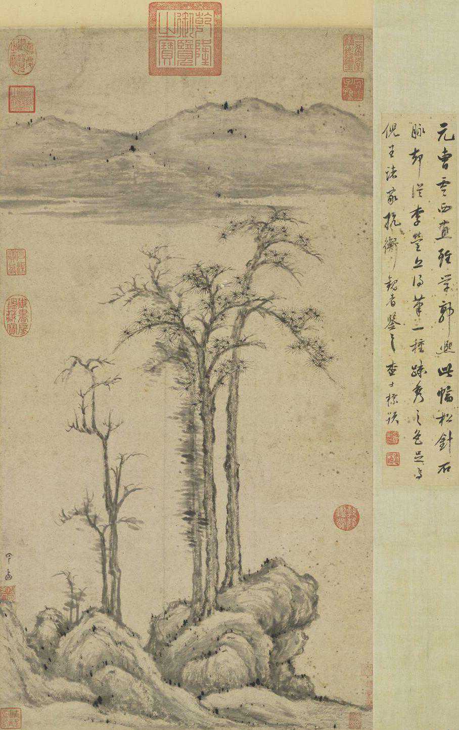 元代画家赵孟頫力倡“复古”并身体力行,其中包括对于《松石图》的复古——他特意创作了一件《双松平远图》(今藏美国大都会艺术博物馆)。赵孟頫所要兴起的,其实正是唐代张璪等人的《松石图》传统,他的改良之处是加入了书法用笔。赵孟頫对于张璪松石的兴趣,有明确的记载。汤垕《古今画鉴》记:“张璪松石,清润可爱。平生尝见四本,并佳。后得《山堂琴会图》,赵子昂见之,欲得不与,因题云:张璪松人间最少,此卷幽深平远,如行山阴道中,诚宝绘也。”当然如从笔墨效果来说,“元四家”中的吴镇以绢本加水墨渲染的方式,相对更忠实地在追踪《松石图》传统。说明这一题材在元代画坛仍有一定受众。