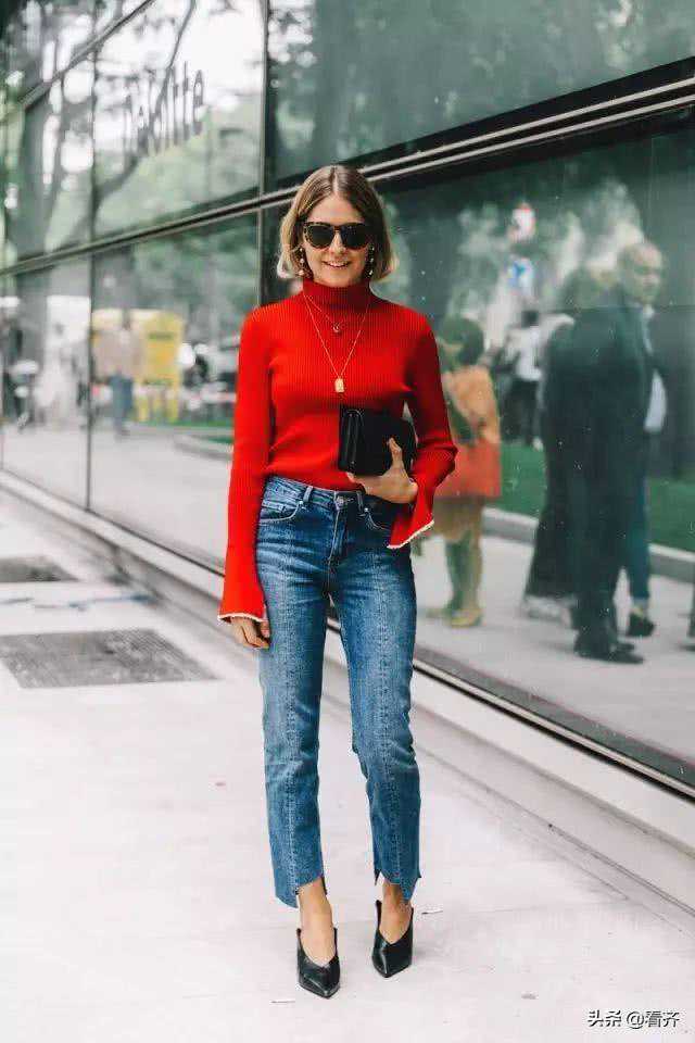 如果你觉得红色外套们太过张扬?一件内搭与日常装相搭配,也有喜庆的效果。毛衣就是个很好的选择。