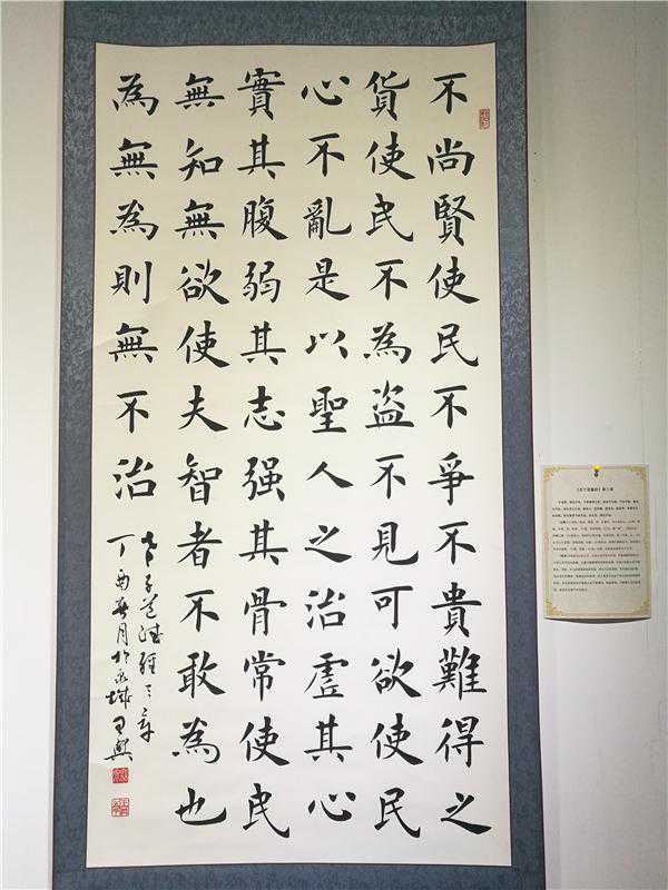 老子《道德经》在中国传统文化中有着重要地位,用楷书展现经典,更是相得益彰。以老子《道德经》全文为内容的展览,这在省市青年书协各种展事中还是首次,其中既有深厚的历史文化底蕴,又有浩然正气的时代风骨,为协会进一步丰富展览内容提供了有益借鉴,也为弘扬传统文化、弘扬书法艺术拓宽了渠道。