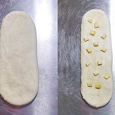 4、4⃣、无需醒面,稍排气后直接整形面团擀橄榄形,若比较宽则可对折一下再擀长,撒上奶酪块从上往下卷起(不能太松)