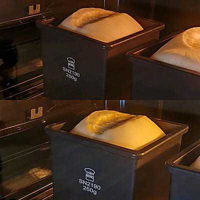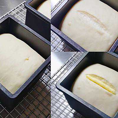 5、5⃣、入模,在环境温度为36度湿度为75%左右的环境下进行最终发酵,发酵至轻按面团表面缓慢回弹(9分).6⃣、预热烤箱的同时,将面团表面割口(两头留一公分左右不割),挤入软化好的黄油