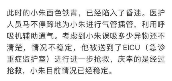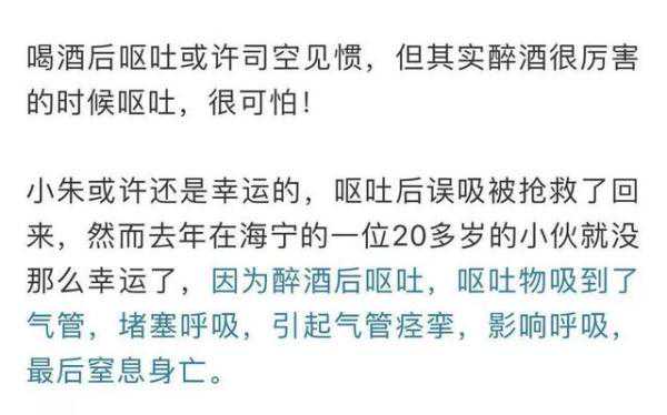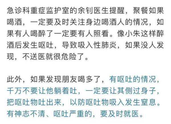那么,小朱到底是怎么了?原来当天小朱晚上吃饭时,一下子喝了2斤白酒,喝醉之后就开始呕吐,这才发生了误吸的事。