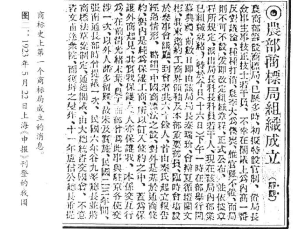 1923年5月4日,北洋政府明令公布施行,商标局依法成立。1923年5月16日,在农商部参事会议厅,举行了我国历史上第一个商标局的成立大会,当时全国主要报纸在重要位置都刊登了商标局成立的消息。