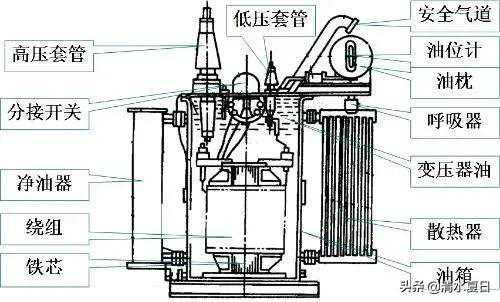 而大功率变压器除了铁芯、绕组、绝缘、引线。之外还有变压器油、变压器油箱和冷却装置、调压装置、保护装置(吸湿器、安全气道、气体继电器、储油柜及测温装置等)和出线套管。