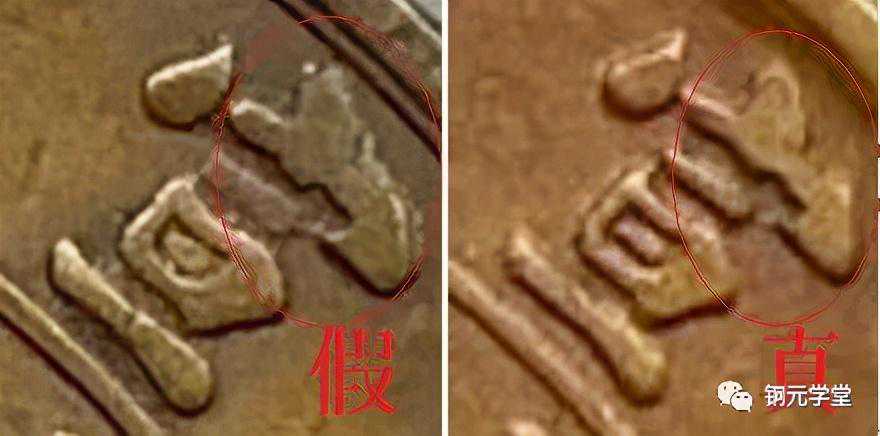 比对上面这枚假币,我总觉得“宣统三年”这几个字,假币过粗了。下面仅以“宣”字举例,剩下的泉友可以自行比对。