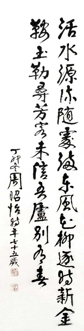 博采众长,自成一格,以篆隶入行楷,终以挺拔刚毅的颜体楷书、行书见长,其作品曾参加全国第一、二、三届书法篆刻展览,1986年11月,其书法佳作在美国展出,获得一致好评。作品除散见于《中国现代书法选》外,还有《周昭怡书法选》、《周昭怡楷书帖》、《岳麓书院记》、《石钟山记》,在书法界颇有影响