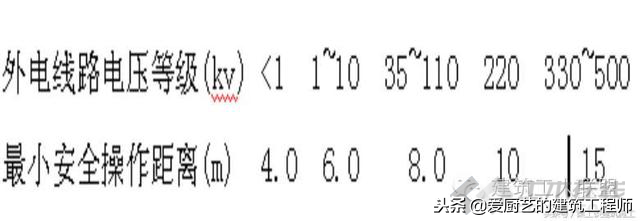 6.7在建工程(含脚手架)的周边与外电架空线路的边线之间的最小安全操作距离应符合表