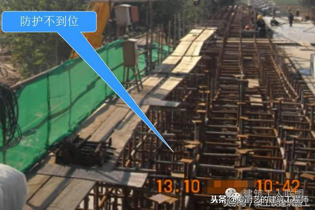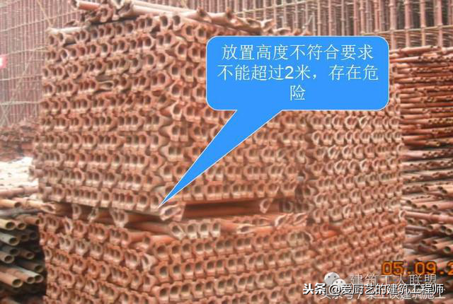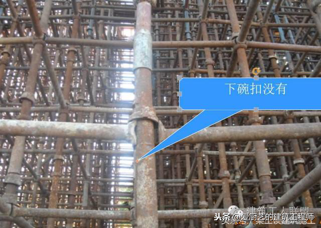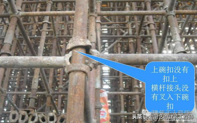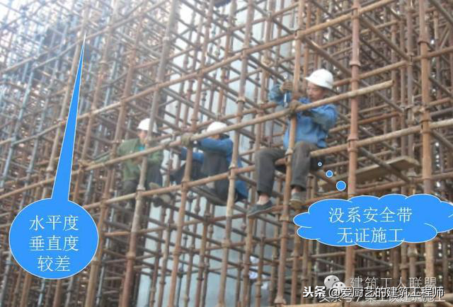 扫地杆缺失,纵横交接处未连接、扫地杆距地距离过大或过小等;脚手板开列、厚度不够、搭接没有满足规范要求;大模板拆除厚内侧立杆与墙体之间没有防坠网;剪刀撑在平面内没有连续;开口脚手架未设斜撑;脚手板下小横杆间距过大;连墙件没有做到内外刚性连接;防护栏杆间距大于600mm;扣件连接不紧,扣件滑移等。