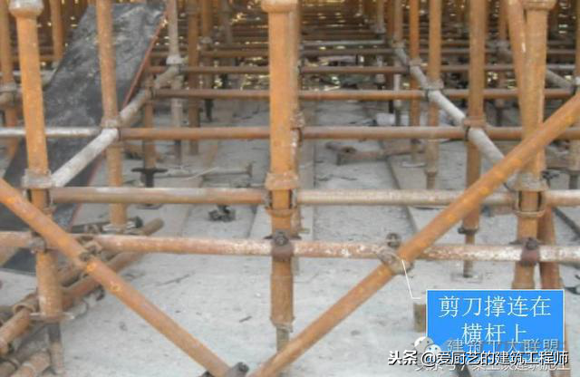 1、现象(1)剪刀撑设置角度偏大,搭接接长偏短,搭接扣件数目不够,剪刀撑斜杆连接不合要求;(2)剪刀撑设置较随意,未连续设置,底部斜杆的下端不到底。2、防治措施(1)每组剪刀撑跨越立杆根数为5-7根(>6m),斜杆与地面夹角在45°-60°之间,搭接长度60-100cm,设置2个以上旋转扣件与立杆或伸出的小横杆连接;(2)剪刀撑应根据方案规定设置,不得在施工中随意设置,在外侧立面沿长度和高度连续设置,底部斜杆的下端应置于垫板上。