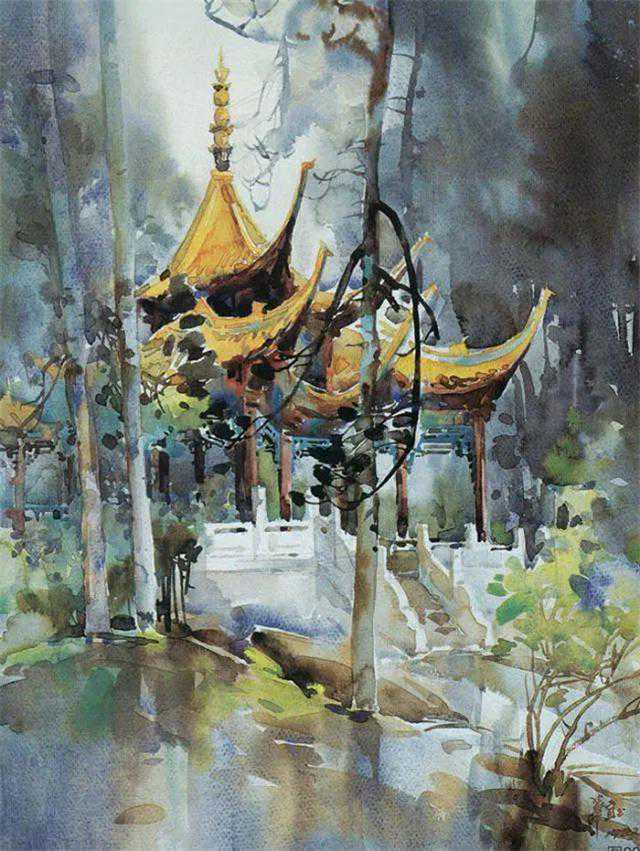 深厚的国画的功力,你在华宜玉的作品中还是能瞥见不少的。因为不论是在表现建筑,花草树木抑或是人物的时候,她的用笔、用色都非常的飘逸洒脱。