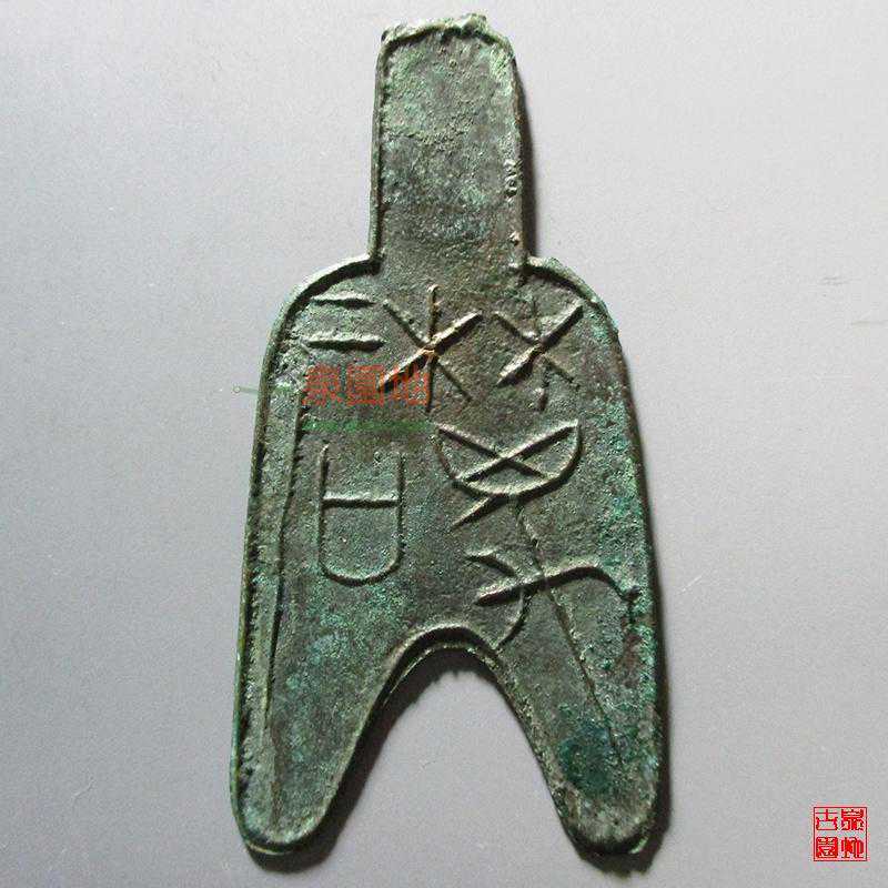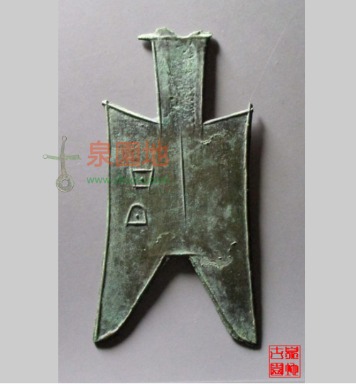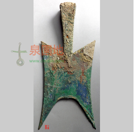 春秋时期至战国初——耸肩尖足空首布铸造地晋,币质青铜,起源于生产工具‘耒’,肩足皆成尖角状,有銎。