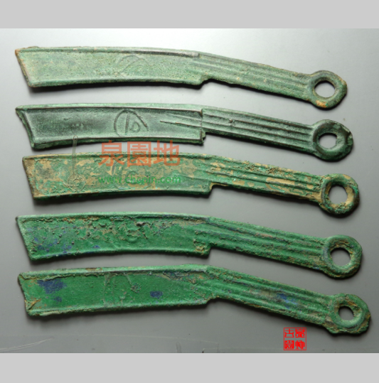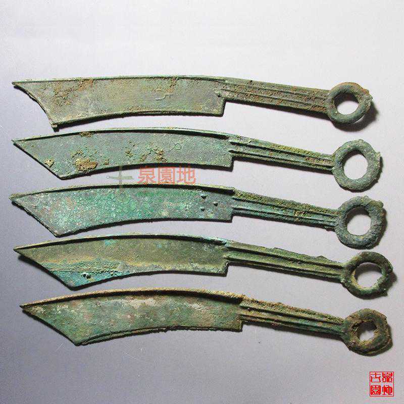 战国中晚期——直刀(圆首刀)铸地赵,中山国,币质青铜,圆首,刀身平直,大者微带弧意,环多呈扁狭状,形体皆轻薄。