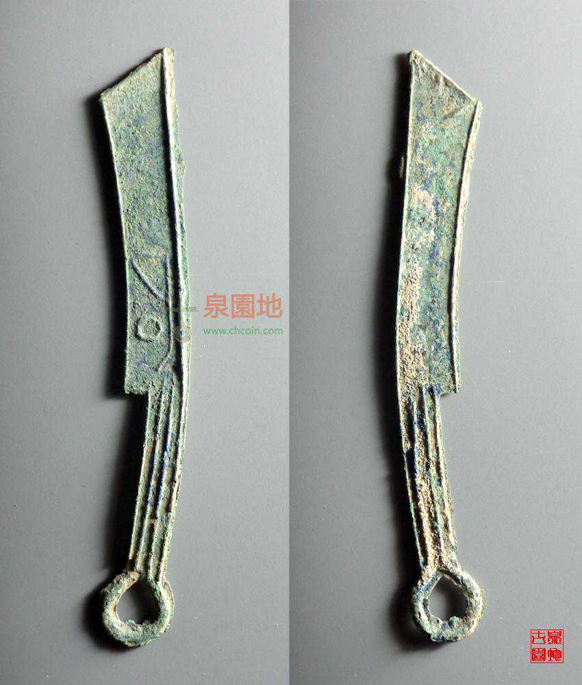 春秋末期至战国早期——尖首刀铸地燕国,币质青铜,首部尖状,面文为记号,符号或单字。