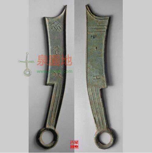 春秋晚期至战国初——针首刀铸地燕,币质青铜,首部细长尖锋,钱文多为记号或符号。