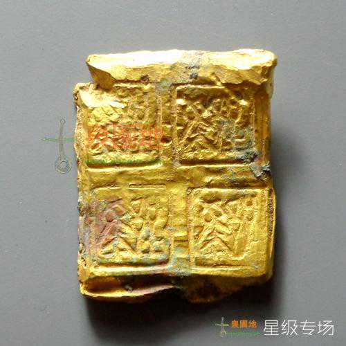 战国——楚金版铸地楚国,币质金,成色96%以上,多为版状,间有圆饼状,每版铸多枚小方形(或圆形)币品,币面均铸阴文,多纪地。