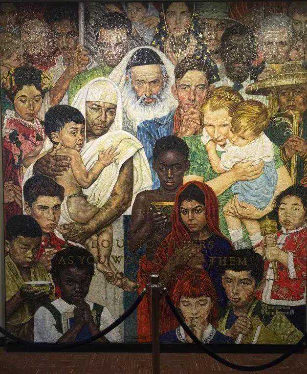 这幅镶嵌画是1985年联合国成立40周年时,由当时的美国第40任总统夫人南西·里根代表美国赠送给联合国,它是根据美国艺术家诺曼·罗克韦尔的一幅名为“为人准则”的画制作的。罗克韦尔想要说明,为人准则是世界各大宗教的共同主题,他描绘了各个种族、信念和肤色的尊严和体面的人。镶嵌画里有一句题词:“己所不欲、勿施于人。”它是由专门从事镶嵌艺术的维也纳艺术家制作的。
