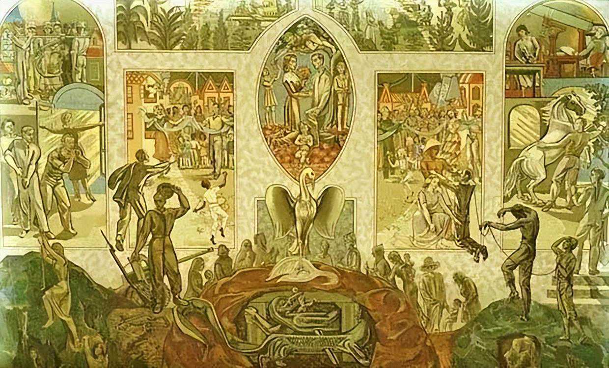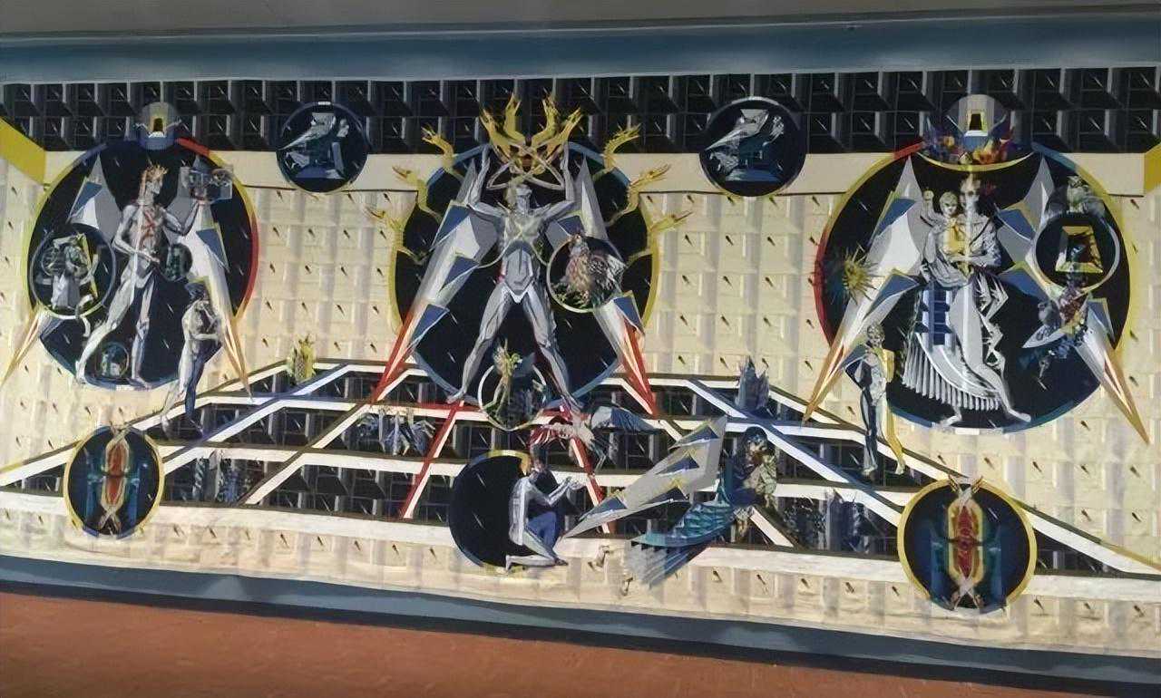 这是由挪威艺术家佩尔·克罗格绘制的一幅壁画,画中有一只长生鸟从灰烬中再生,象征着世界在第二次世界大战后的重建;在底部阴暗的颜色上方,画有色彩鲜艳的图象,象征着未来世界更加美好;一群人在称粮食给所有人分享,象征着平等。
