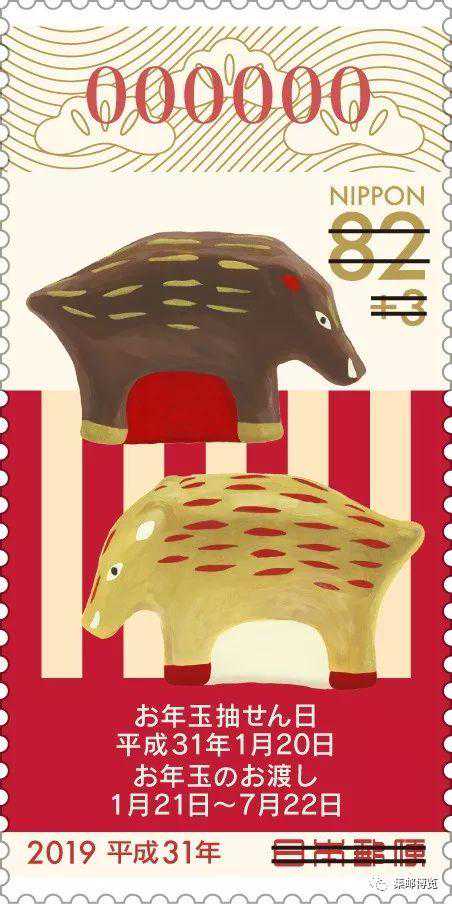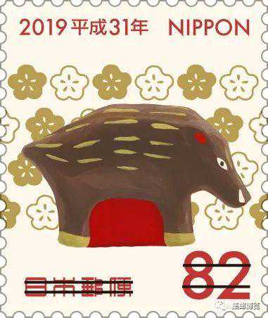 2018年11月1日,日本邮政发行一套猪年贺年邮票,按照惯例,包括两枚生肖邮票和两枚有奖生肖邮票。第一种面值62日元和有奖邮票的图案选用会津的中汤川地区的玩具猪,这是若松市的青柳守彦在1982年制作的与猪有关的玩具。第二种面值82日元和有奖邮票的图案选用秋田县秋田市的八桥玩具。