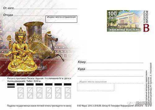 2018年10月26日,俄罗斯邮政为俄罗斯国家东方艺术博物馆建馆100周年发行一枚纪念邮资片。于1918年10月30日开馆的俄罗斯国家东方艺术博物馆是俄罗斯唯一的一座最完整地展示中亚、高加索、外高加索、哈萨克斯坦、布里亚特、远东、中东和非洲艺术的文化机构。博物馆收藏的主要是俄罗斯著名收藏家的私人藏品、俄罗斯国家基金会和各机构捐给博物馆的藏品。