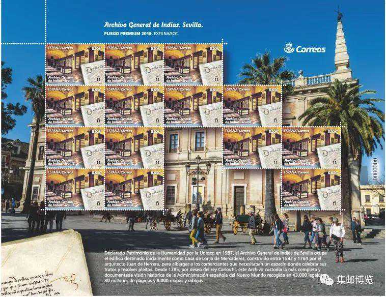 2018年10月31日,西班牙邮政发行一枚邮票,主题为塞维利亚的西印度群岛综合档案馆。建于1785年的西印度群岛综合档案馆收藏有从征服到19世纪末的丰富档案,包括塞万提斯的求职请求、亚历山大六世为西班牙和葡萄牙划分世界的教宗诏书、哥伦布的日志、美洲殖民地美国城市的地图和规划等。其建筑由胡安·德·埃雷拉(JuandeHerrera)设计,是西班牙意大利式文艺复兴建筑的实例。1987年,这座建筑被联合国教科文组织列为世界遗产。