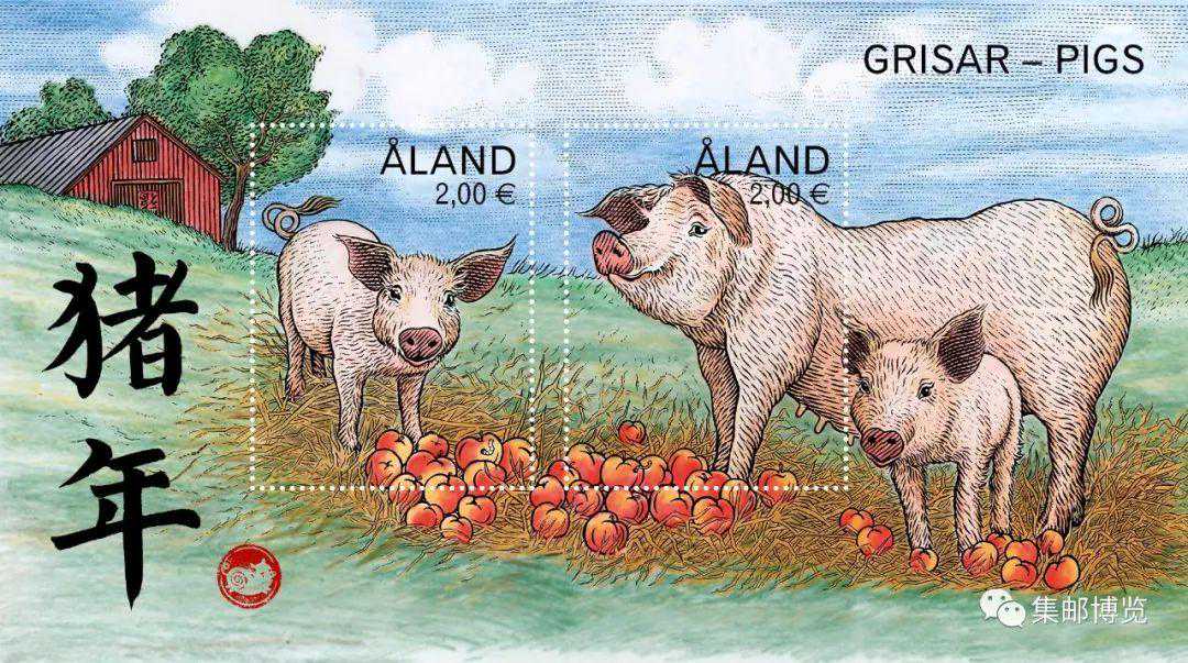 2018年11月1日,奥兰群岛邮政发行一套两枚农历生肖猪年邮票和一枚小全张。与往年一样,还是邀请瑞典的邮票雕刻大师MartinMörck设计。这是奥兰群岛邮政生肖系列的第五种邮票。MartinMörck说他在中国的岁月使他更加深入地了解了集邮爱好者的喜好,因此他的这套邮票所强调的是猪的“好奇心和聪慧”。他说猪尾巴设计成八字形,是代表“发财”的意思,而且,小全张背景图案的谷仓上还有“福”字倒贴,果然是位中国通设计师啊。