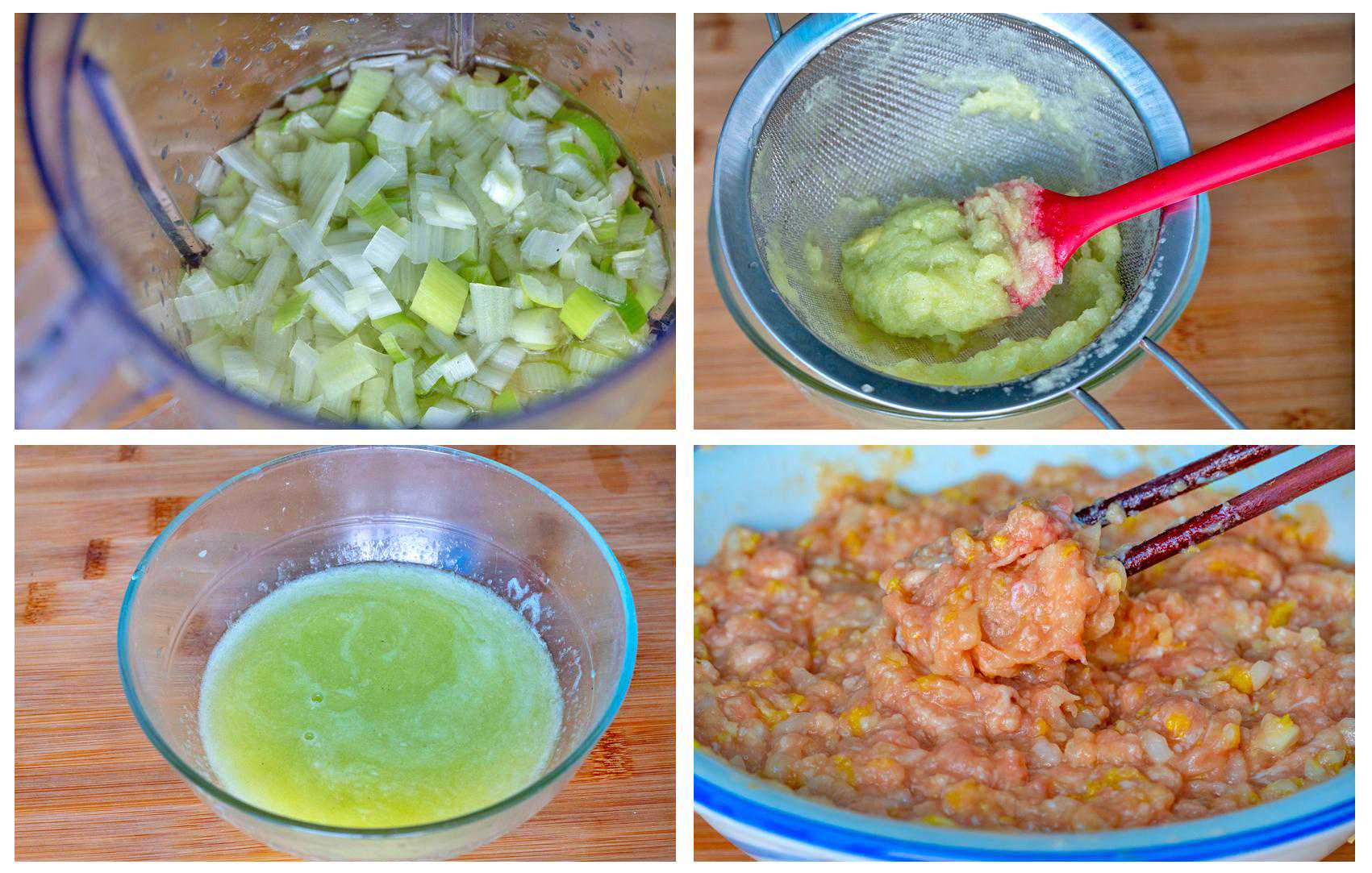 8、过滤出来的汁分几次加入到肉馅中,少量多次的加,搅拌至汤汁完全被吸收以后再继续加,直到全部加完,汤汁也被完全的吸收就可以了,这就是肉馅儿汤汁饱满的一个小技巧;