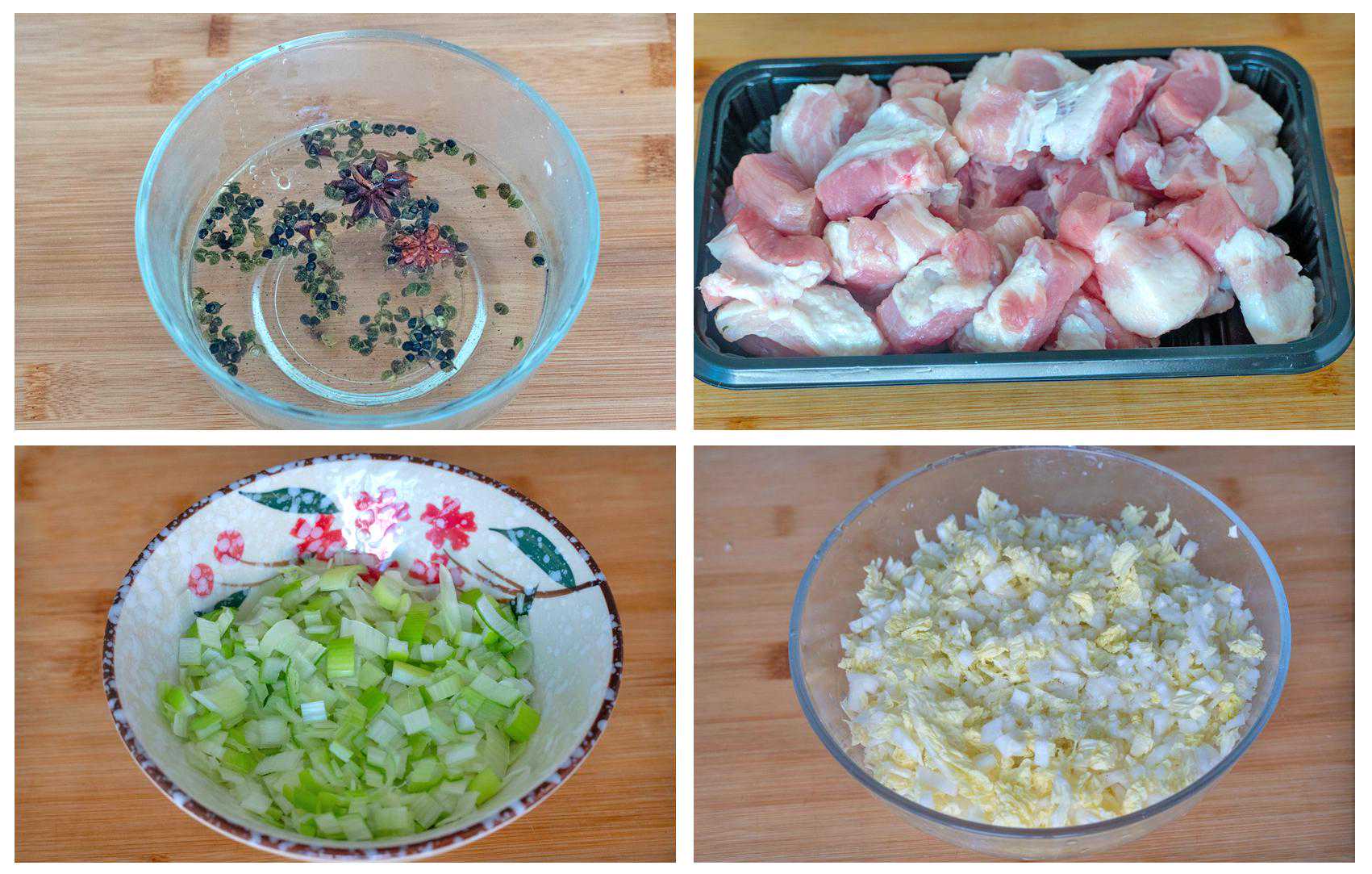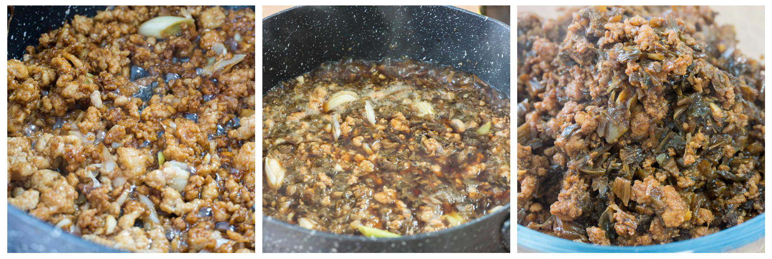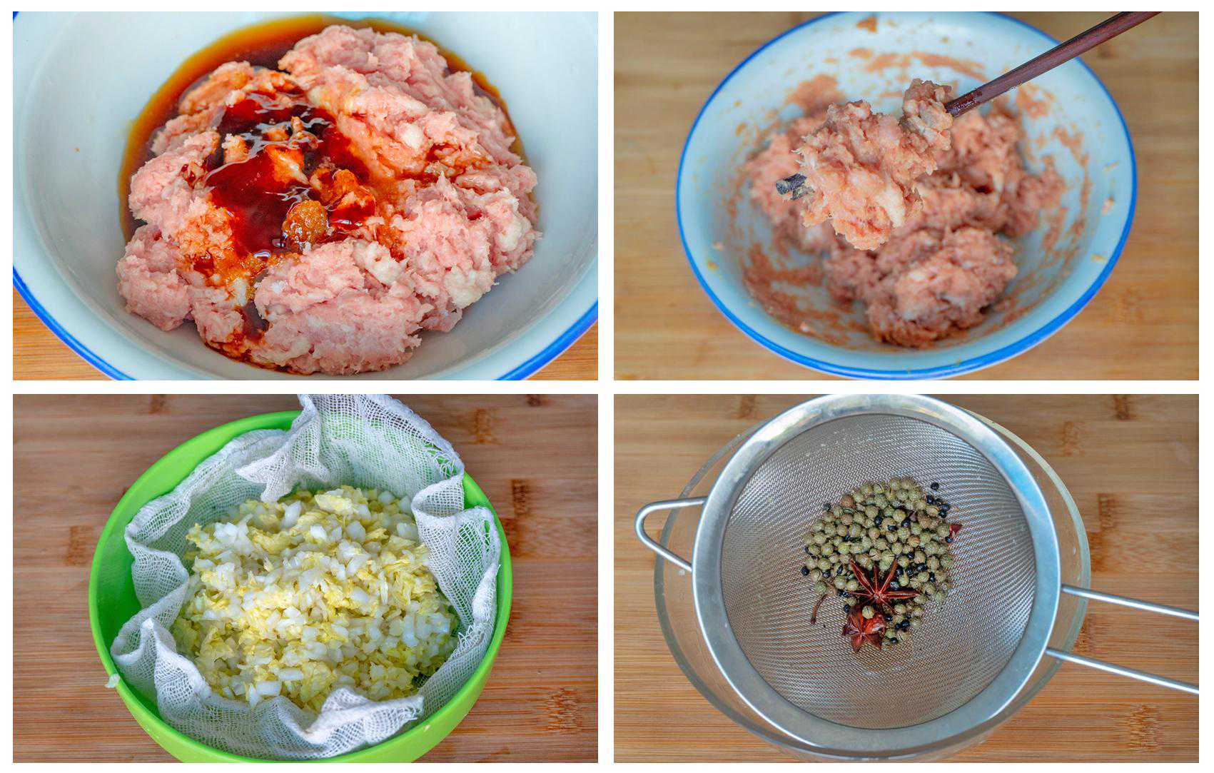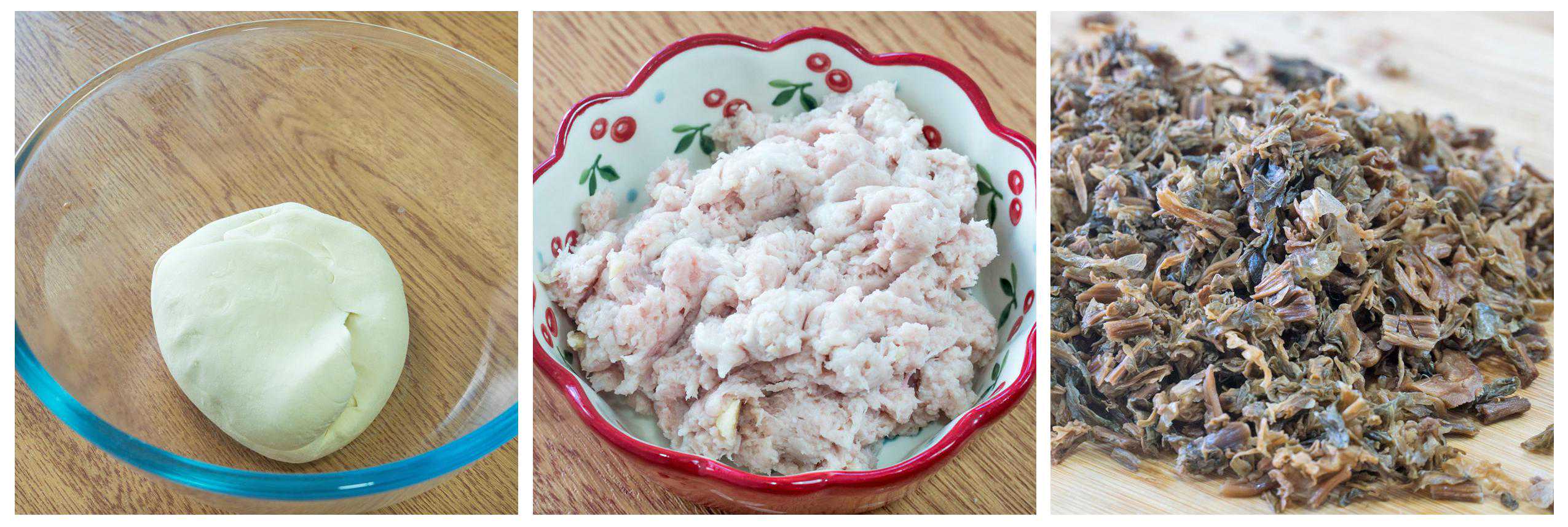 馅儿:梅干菜80克、猪肉500克、料酒1勺、生抽1勺、老抽1勺、蚝油1勺、盐1勺、糖2勺、胡椒粉适量、鸡精适量