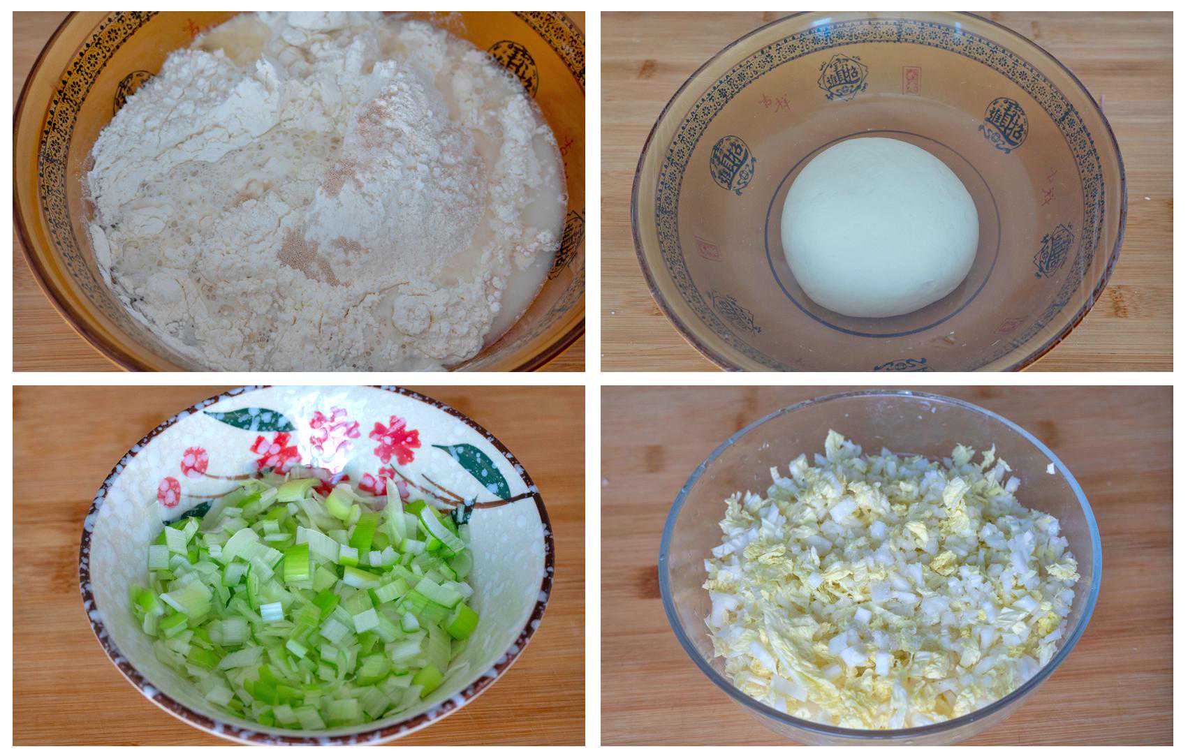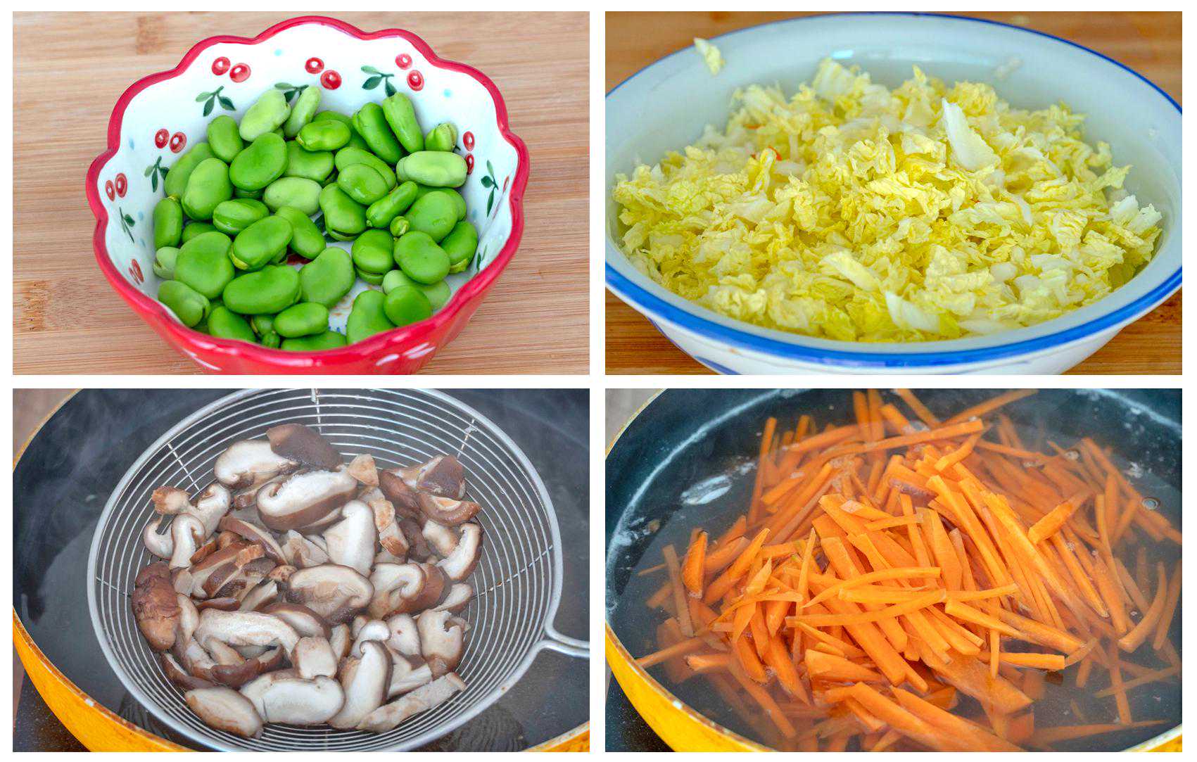 馅儿食材:豆子90克、新鲜的香菇80克、白菜240克、胡萝卜280克、鸡蛋4个