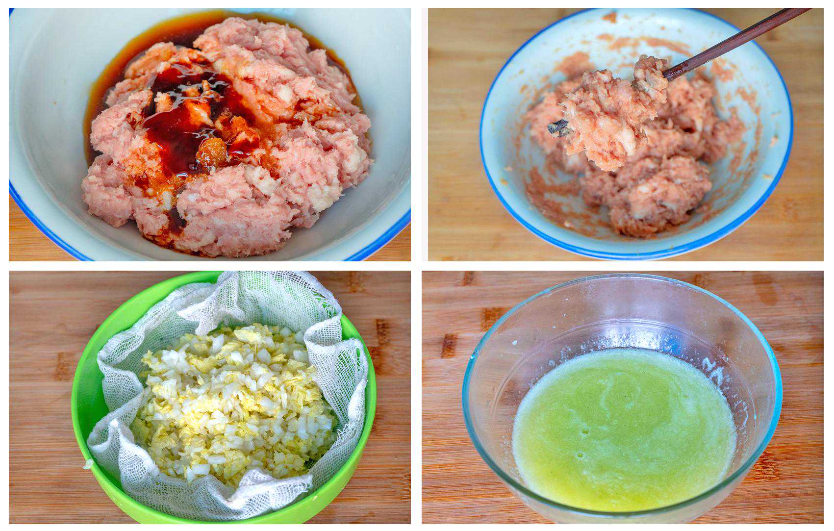5、过滤倒出,分次加到肉馅中,少量多次的加,搅拌至汤汁完全被吸收以后再继续加,这就是肉馅儿汤汁饱满的原因,最后加白菜和20克食用油,油主要是锁住水份,防止水份跑出来,肉馅儿就调好了,已经能闻到香味了;