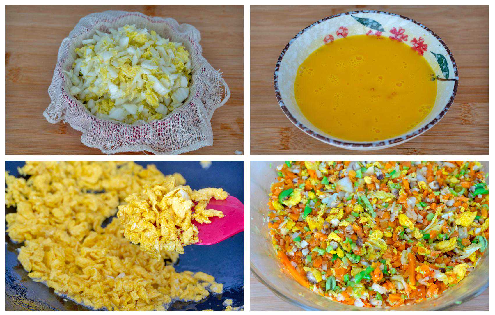 4、鸡蛋4个打散,热锅倒油,倒入蛋液,炒至鸡蛋稍微的有一点点的变焦再出锅,盛出来装到一个大一点的碗中,挤干水份的白菜和打好的蔬菜也加进来;