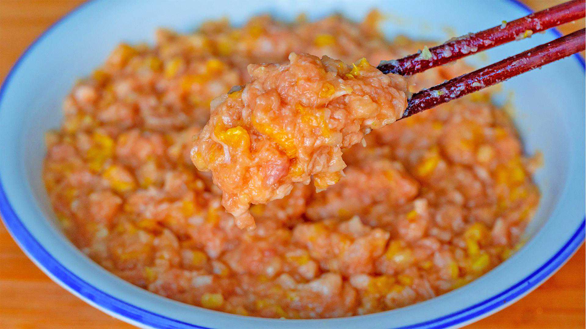 3、这里是我提前打好的肉泥,重300克,1勺盐调味、1勺糖提鲜、生抽、蚝油、料酒、一点点鸡精,朝着一个方向搅打上劲;